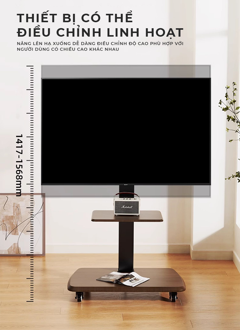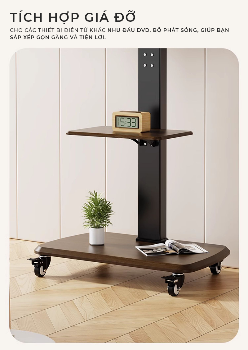 Công năng: Là mẫu giá treo tivi di động kèm kệ để đồ tiện lợi phù hợp nhiều không gian như phòng khách, phòng ngủ, phòng họp, phòng cộng đồng, ...