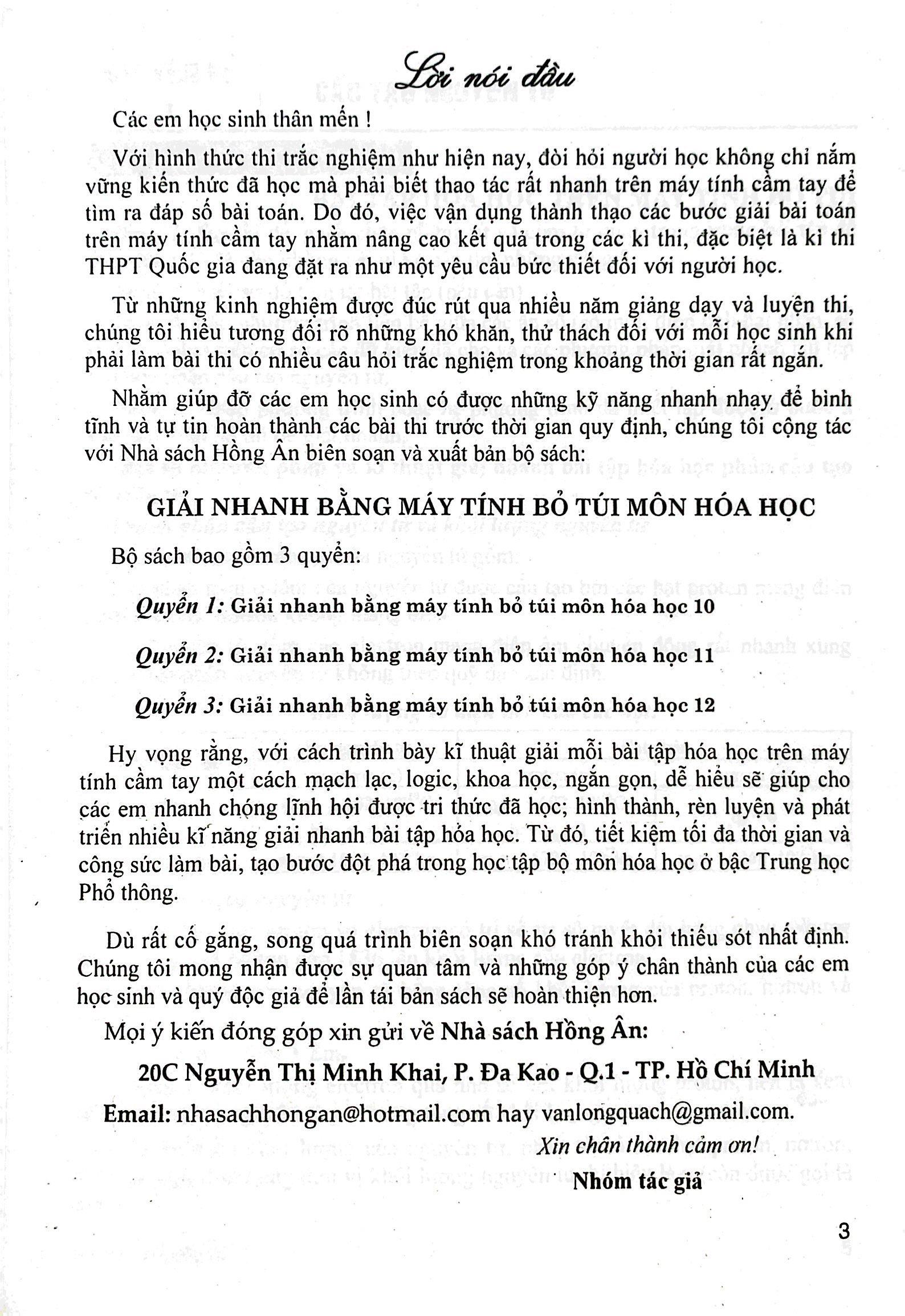 Nhằm đáp ứng được nhu cầu cấp thiết nói trên, cuốn sách tham khảo Giải Nhanh Bằng Máy Tính Bỏ Túi Môn Hóa Học 10 (Biên Soạn Theo Chương Trình GDPT Mới) đã được ra đời. Với cách trình bày kĩ thuật giải mỗi bài tập trên máy tính cầm tay một cách mạch lạc, logic, khoa học, ngắn gọn, dễ hiểu sẽ giúp các bạn học sinh nhanh chóng lĩnh hội được tri thức đã học, hình thành, rèn luyện và phát triển nhiều kĩ năng giải nhanh bài tập hóa học 10. Từ đó, tiết kiệm được tối đa thời gian và công sức làm bài, tạo bước đột phá trong học tập bộ môn này.