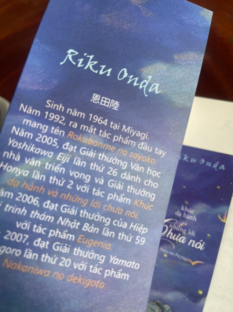 Độc giả đã không còn xa lạ với cái tên Riku Onda. Bà sinh năm 1964 tại Miyagi, Nhật Bản. Riku Onda được biết đến 10 năm chắp bút cho tác phẩm đoạt giải Naoki Ong Mật Và Sấm Rền. Tác phẩm KHÚC DẠ HÀNH VÀ NHỮNG LỜI CHƯA NÓI của nhà văn cũng đạt Giải thưởng Văn học Yoshikawa Eiji lần thứ 26 dành cho nhà văn triển vọng và Giải thưởng Honya lần thứ 2, gây tiếng vang trong văn học Nhật Bản hiện đại.