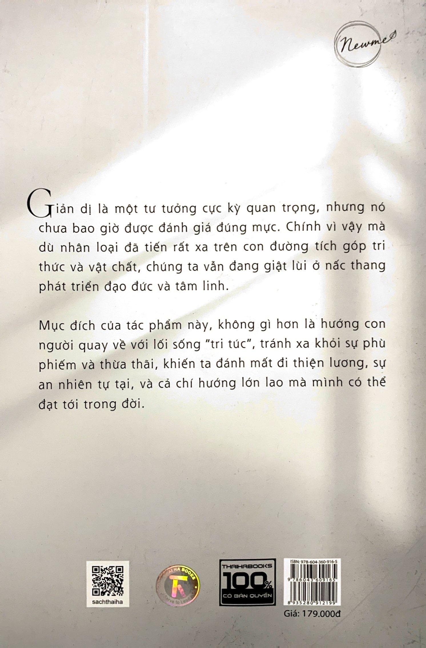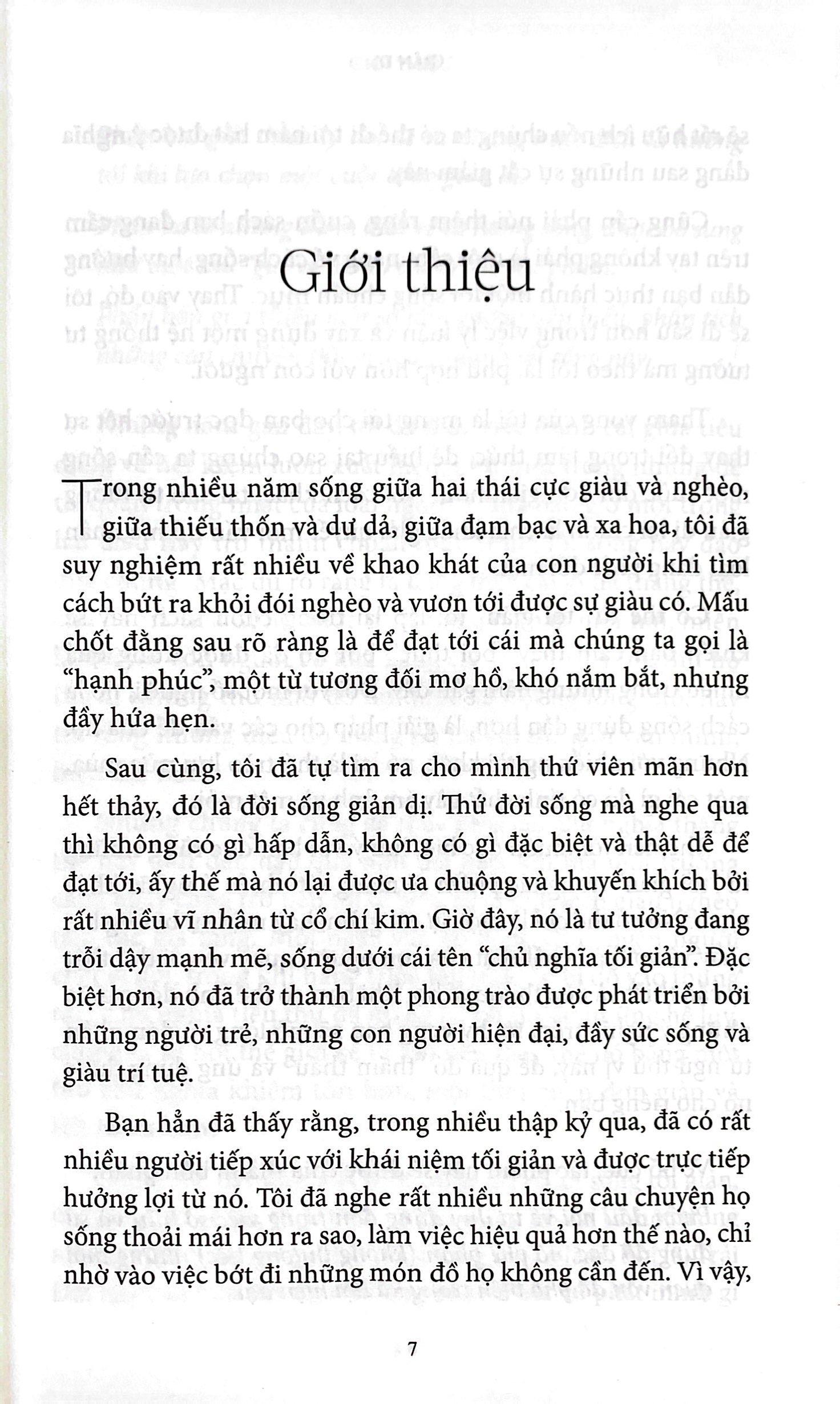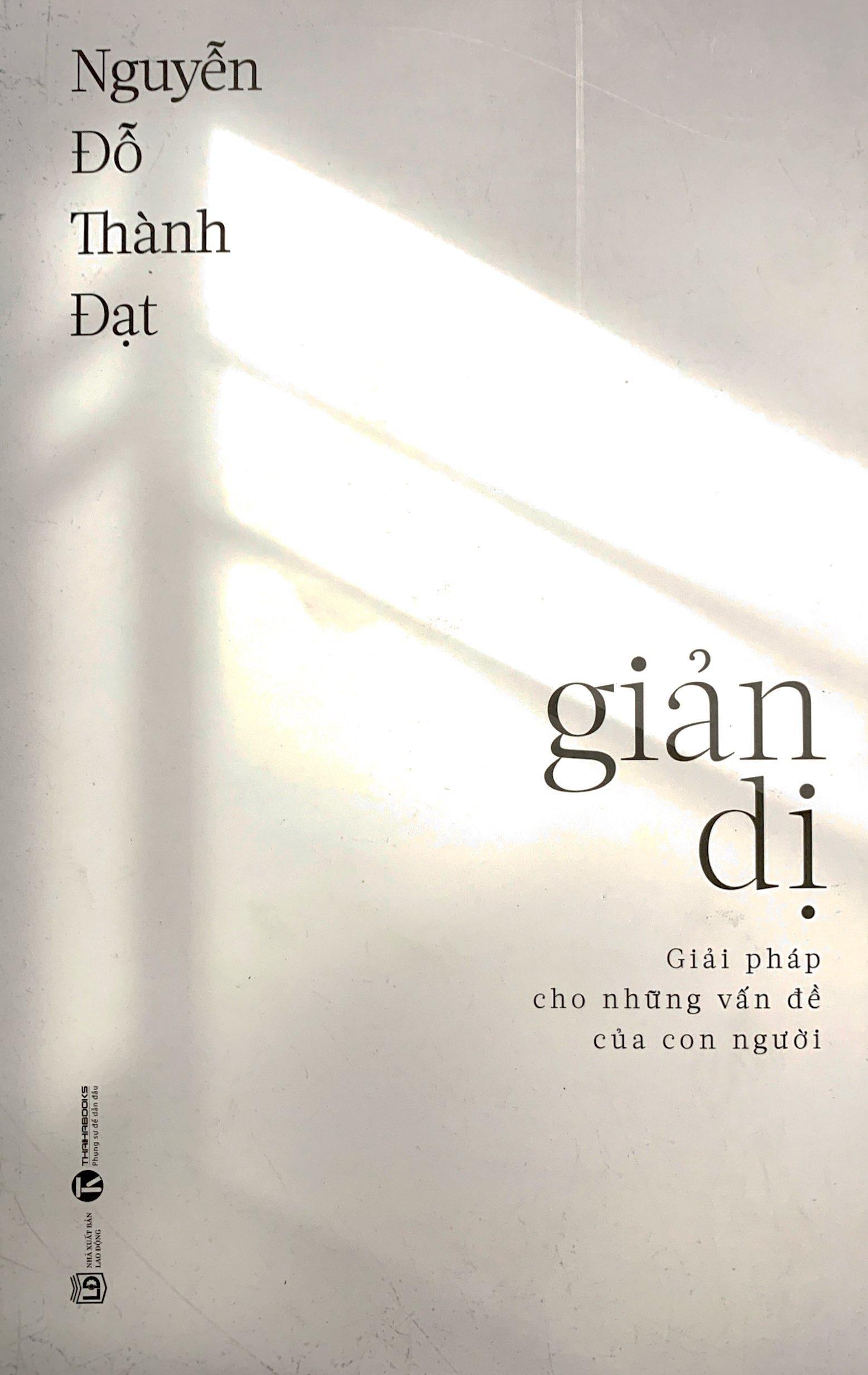 Cuốn sách này không phải là một cẩm nang về cách sống, hay hướng dẫn bạn thực hành một lối sống chuẩn mực. Thay vào đó, cuốn sách đi sâu hơn trong việc lý luận và xây dựng một hệ thống tư tưởng cho một cuộc sống đơn giản và hiệu quả. Trong cuốn sách Giản dị, tác giả Nguyễn Đỗ Thành Đạt đã đưa ra những suy nghiệm và tư tưởng về phương cách sống giản dị, một lối sống được nhiều người theo đuổi. Với mong muốn mang tới cho bạn đọc trước hết sự thay đổi trong tâm thức, để hiểu tại sao chúng ta cần sống một cuộc đời đơn giản hơn, nói cách khác, tại sao tư tưởng giản dị lại chính là chìa khóa giải quyết mọi vấn đề mà nhân loại đang phải đối mặt. Trích lời tác giả: “Trong nhiều năm sống giữa hai thái cực giàu và nghèo, giữa thiếu thốn và dư dả, giữa đạm bạc và xa hoa, tôi đã suy nghiệm rất nhiều về khao khát của con người khi tìm cách bứt ra khỏi đói nghèo và vươn tới được sự giàu có. Mấu chốt đằng sau rõ ràng là để đạt tới cái mà chúng ta gọi là “hạnh phúc”, một từ tương đối mơ hồ, khó nắm bắt, nhưng đầy hứa hẹn. Sau cùng, tôi đã tự tìm ra cho mình thứ viên mãn hơn hết thảy, đó là đời sống giản dị. Thứ đời sống mà nghe qua thì không có gì hấp dẫn, không có gì đặc biệt và thật dễ để đạt tới, ấy thế mà nó lại được ưa chuộng và khuyến khích bởi rất nhiều vĩ nhân từ cổ chí kim. Giờ đây, nó là tư tưởng đang trỗi dậy mạnh mẽ, sống dưới cái tên “chủ nghĩa tối giản”. Đặc biệt hơn, nó đã trở thành một phong trào được. phát triển bởi những người trẻ, những con người hiện đại, đầy sức sống và giàu trí tuệ.” Về bố cục, tác phẩm này sẽ được chia thành bốn phần: Phần đầu nói về tư duy đúng đắn trong việc sở hữu và sử dụng đồ đạc, nó phê phán (không thương tiếc) những thói quen vốn đã phổ biến trong xã hội hiện đại. Phần hai giải thích lý do, đề ra những mục đích ta hướng tới khi lựa chọn một cuộc sống giản dị. Phần ba là những thêm thắt về tư tưởng sống, được bổ sung như một thứ “gia vị” hoàn chỉnh cho tác phẩm. Phần bốn giới thiệu một số tấm gương tiêu biểu, phân tích những câu chuyện thú vị xoay quanh lối sống này. Trích đoạn sách: Bỏ đi được tâm sợ hãi sự sở hữu không có nghĩa là ta lại bắt đầu tích góp cho mình mọi thứ hay ho ở trên đời. Với tư duy rằng nếu ta không đam mê chúng thì việc ta có nhiều hay ít không còn quan trọng nữa. Thực tế là điều này vẫn tạo ra ảnh hưởng lên bản thân bạn, bạn cần biết rằng trên đời này không có nhiều thứ thực sự cần sở hữu, chúng tồn tại chỉ để lấy cắp đi thời gian và năng lượng quý giá của cuộc đời bạn mà thôi. Đúng như vậy, tôi muốn nói rằng hầu hết các phát minh đều là không cần thiết cho bạn, phần lớn trong số chúng vẫn có ích lợi với ai đó, trong một hoàn cảnh nào đó, nhưng tuyệt đối không phải là với bạn. Tiếng Anh có một thuật ngữ rất hay để biểu thị điều này, đó là “nice-to-have”, nghĩa là có thì cũng hay đấy, thú vị đấy, nhưng không có thì cũng chả sao, chẳng là vấn đề với bạn (ít nhất là ở hiện tại). Những người có quá nhiều thứ để lo lắng và khao khát, thì rất khó có đủ thời gian cho chính bản thân họ. Tôi đặc biệt nhấn mạnh cụm từ “bản thân họ”, bởi nhiều người thường hay nhầm lẫn, đánh đồng những đồ vật họ sở hữu với chính con người, bản thể của họ. Đặc biệt là với những món đồ có giá trị cao, những món đồ mà có khi họ phải dành ra rất nhiều năm cố gắng, đã phải gạt bỏ danh dự, lương tâm của mình để có cho được. Thậm chí họ đã phải liều cả mạng sống của mình để mang về thứ tiền tài vật chất ấy, nên họ luôn lẫn lộn, họ lấy chúng làm thước đo cho nhân phẩm, cho bản ngã, cho việc họ có đáng quý giữa xã hội này hay không. Họ quan tâm tới thứ quần áo này, đồ công nghệ kia, họ tìm hiểu tất tần tật về các bộ phim, các nghệ sĩ, họ cập nhật và nghe mọi bản nhạc mới nhất, sưu tầm đủ thứ vật dụng quý hiếm, hay săn lùng, mang về, chất đầy các món đồ sang trọng để tô điểm cho căn nhà của họ. Như vậy thì lấy đâu ra thời gian để mà quan tâm tới những thứ giá trị hơn nhiều, như an dưỡng cho tâm hồn, bồi bổ cho trí tuệ? Bởi vì chú trọng tới mấy cái đó, đời sống của họ ở nhiều mặt khác cũng bị ảnh hưởng, như họ sẽ có xu hướng thích đi ra ngoài, tới các bữa tiệc, gặp gỡ bạn bè, trải nghiệm mọi loại dịch vụ, tận hưởng các lạc thú mà con người đến nay có thể nghĩ ra được. Nói cách khác, niềm đam mê đồ vật đi kèm với niềm đam mê các hoạt động lạc thú, chúng song hành cùng nhau, bởi chúng là thứ hỗ trợ không thể thiếu để gia tăng các lạc thú ấy