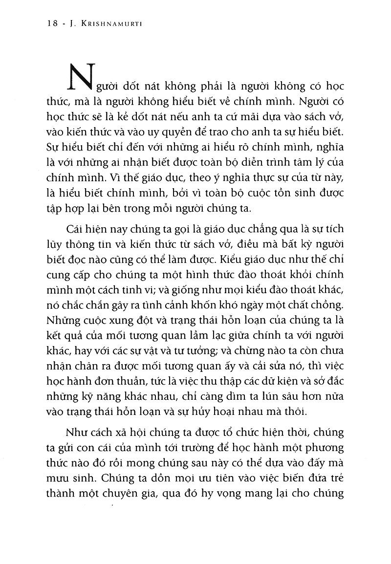Khi phát biểu rằng: nếu ta được giáo dục chỉ để trở nên khác biệt, giành lấy một công việc tốt hơn, có nhiều năng lực hơn, thống trị người khác nhiều hơn, thì cuộc sống của ta sẽ trở nên hời hợt và trống rỗng vô cùng, namurti đã tạo nên sự rúng động không chỉ ở Ấn Độ, quê hương ông, mà còn với cả thế giới.
