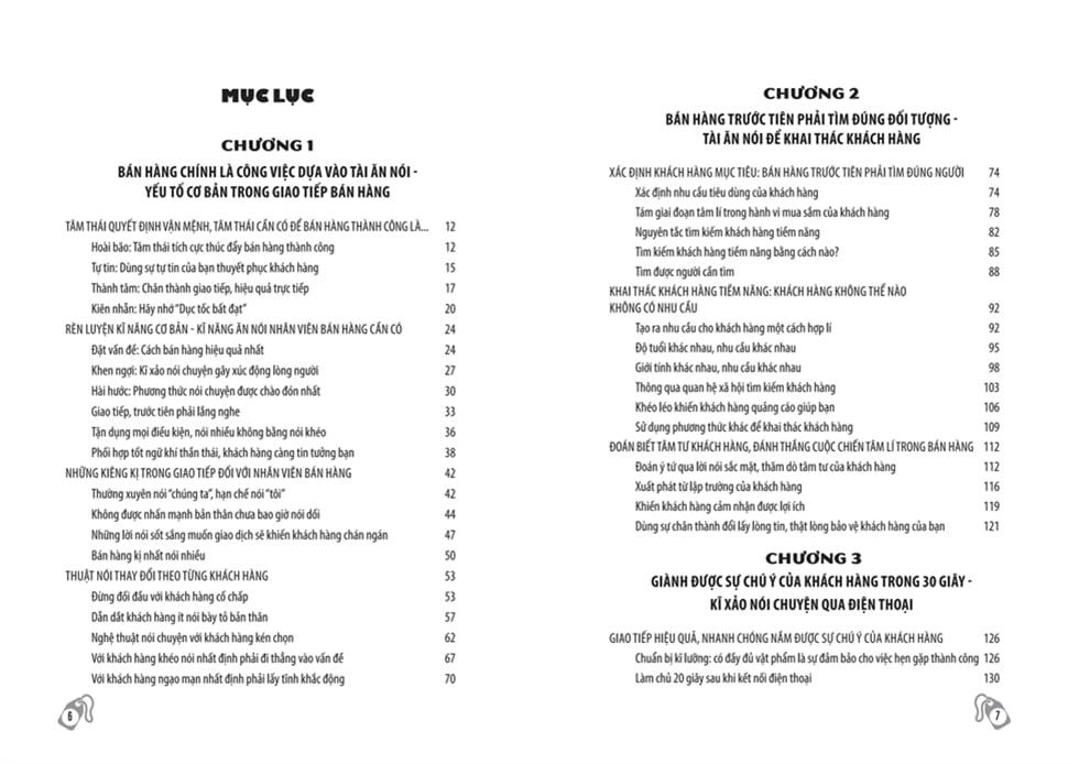 Nội dung cuốn sách được chia làm bảy chương, giải đáp tỉ mì từng giai đoạn trong quá trình bán hàng bao gồm: yếu tố cơ bản trong giao tiếp bán hàng, tài ăn nói để khai thác khách hàng hữu hiệu, kỹ xảo nói chuyện qua điện thoại, kĩ xảo thực chiến khi tiếp cận khách hàng, bồi dưỡng phẩm chất đạo đức bản thân, phương pháp khiến khách hàng nhanh chóng đồng thuận tiến hành giao dịch và các vấn đề phía sau mỗi đơn hàng…