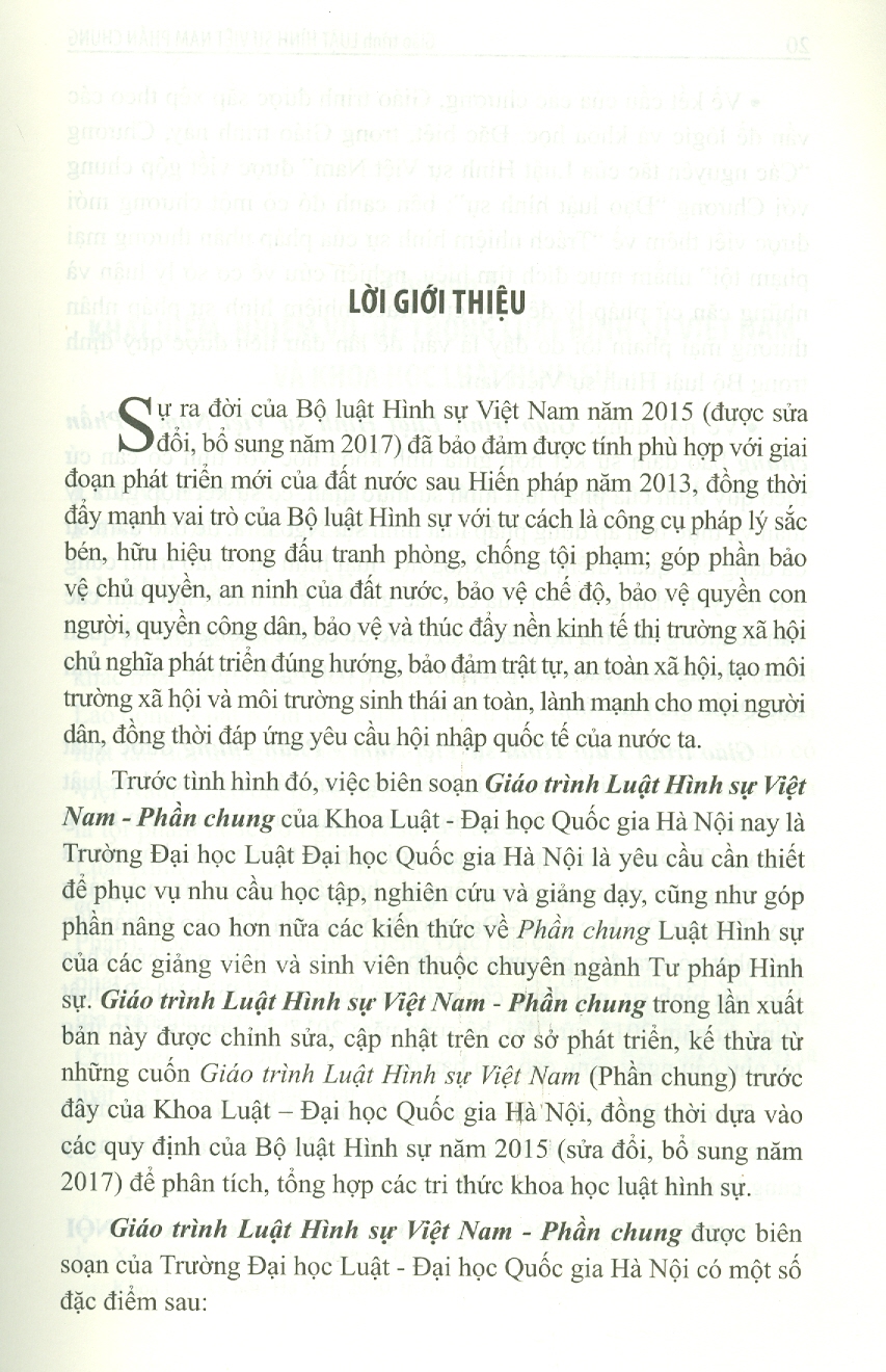 Giáo trình Luật Hình sự Việt Nam - Phần chung Với sự phát triển và đòi hỏi của xã hội, cũng như nhằm phục vụ công tác học tập, nghiên cứu và giảng dạy, Trường Đại học Luật - Đại học Quốc gia Hà Nội đã xuất bản Giáo trình Luật Hình sự Việt Nam - Phần chung với sự tham gia biên soạn của các nhà khoa học luật hình sự có uy tín và những giảng viên có nhiều kinh nghiệm trong lĩnh vực tư pháp hình sự. Cuốn sách bạn đang cầm trên tay đã được tái bản lần thứ nhất có sửa đổi, bổ sung và cập nhật các tri thức mới của khoa học luật hình sự, nội dung các văn bản hướng dẫn thi hành Bộ luật Hình sự năm 2015, sửa đổi, bổ sung năm 2017. Cuốn sách tái bản lần này có một số điểm mới đáng chú ý so với bản in năm 2021: