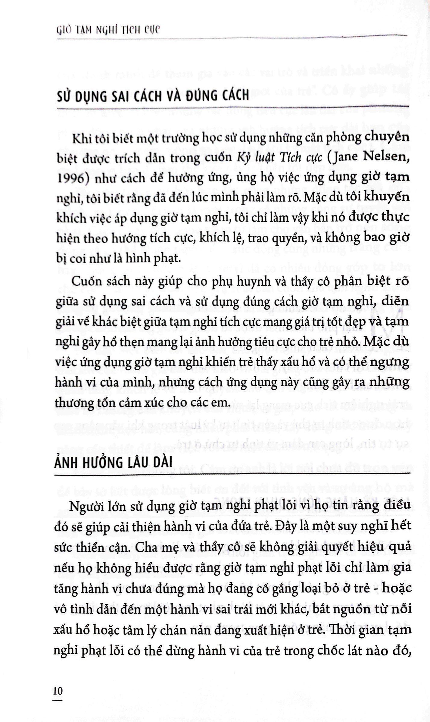Giờ tạm nghỉ chỉ có hiệu quả khi nó được thực hiện theo hướng tích cực, khích lệ, trao quyền, và không bao giờ coi đó là hình phạt. Cuốn sách này sẽ giúp cho phụ huynh và thầy cô phân biệt rõ giữa sử dụng sai cách và sử dụng đúng cách giờ tạm nghỉ, diễn giải về khác biệt giữa tạm nghỉ tích cực mang giá trị tốt đẹp và tạm nghỉ phạt lỗi mang lại tiêu cực cho trẻ nhỏ. Mặc dù việc ứng dụng giờ tạm nghỉ phạt lỗi khiến trẻ thấy xấu hổ và có thể làm ngưng hành vi của m.ình, nhưng cách ứng dụng này cũng gây ra những thương tổn cảm xúc cho các em.