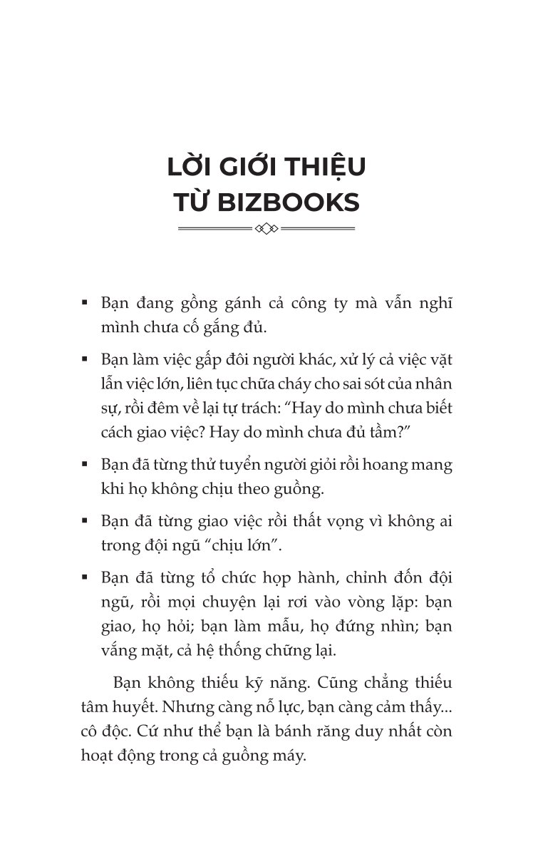 Thứ nhất, cuốn sách giúp bạn “gọi tên” những vấn đề bạn luôn biết nhưng chưa từng dám thừa nhận. Bạn từng cảm thấy mình đang làm thay quá nhiều, rằng công ty này vận hành dựa vào bạn chứ không phải đội ngũ. Bạn từng thở dài vì nhân sự thiếu chủ động, hay thất vọng khi bạn truyền lửa rất nhiều mà họ vẫn dửng dưng. Nhưng bạn luôn nghĩ: “Có lẽ do họ không hiểu”, “Có lẽ mình cần cố thêm một chút nữa”… Cuốn sách không cho bạn tiếp tục viện cớ như vậy nữa. Nó chỉ thẳng: Bạn chưa dẫn dắt đúng. Bạn chưa thực sự xây hệ thống. Bạn vẫn đang làm, không phải lãnh đạo.