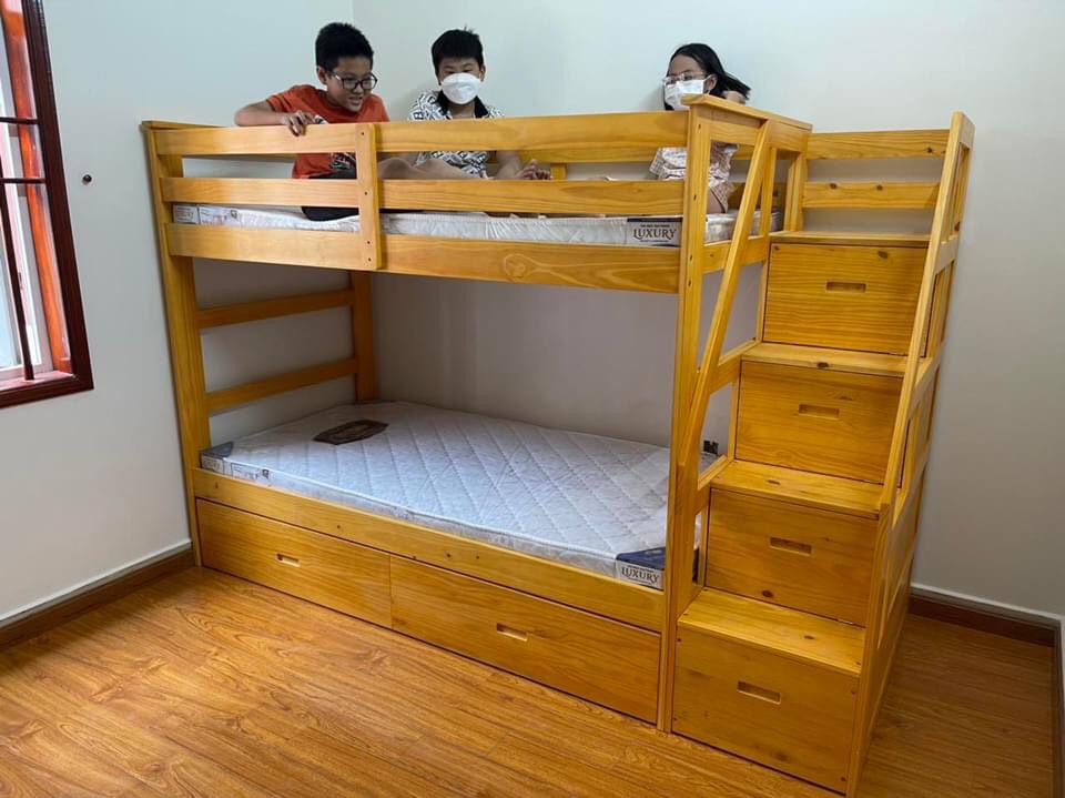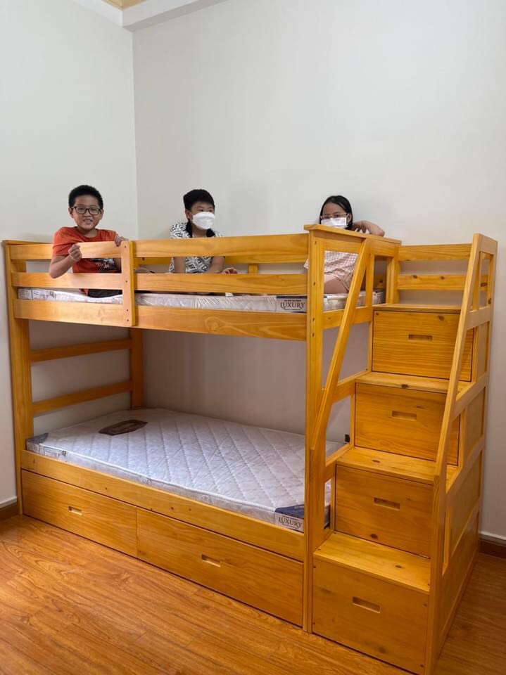 Thông tin sản phẩm: Sản phẩm chỉ bao gồm giường 2 tầng và cầu thang, không kèm các phụ kiện khác. - Chất liệu gỗ thông lâu năm nhập khẩu Canada bền bỉ, an toàn