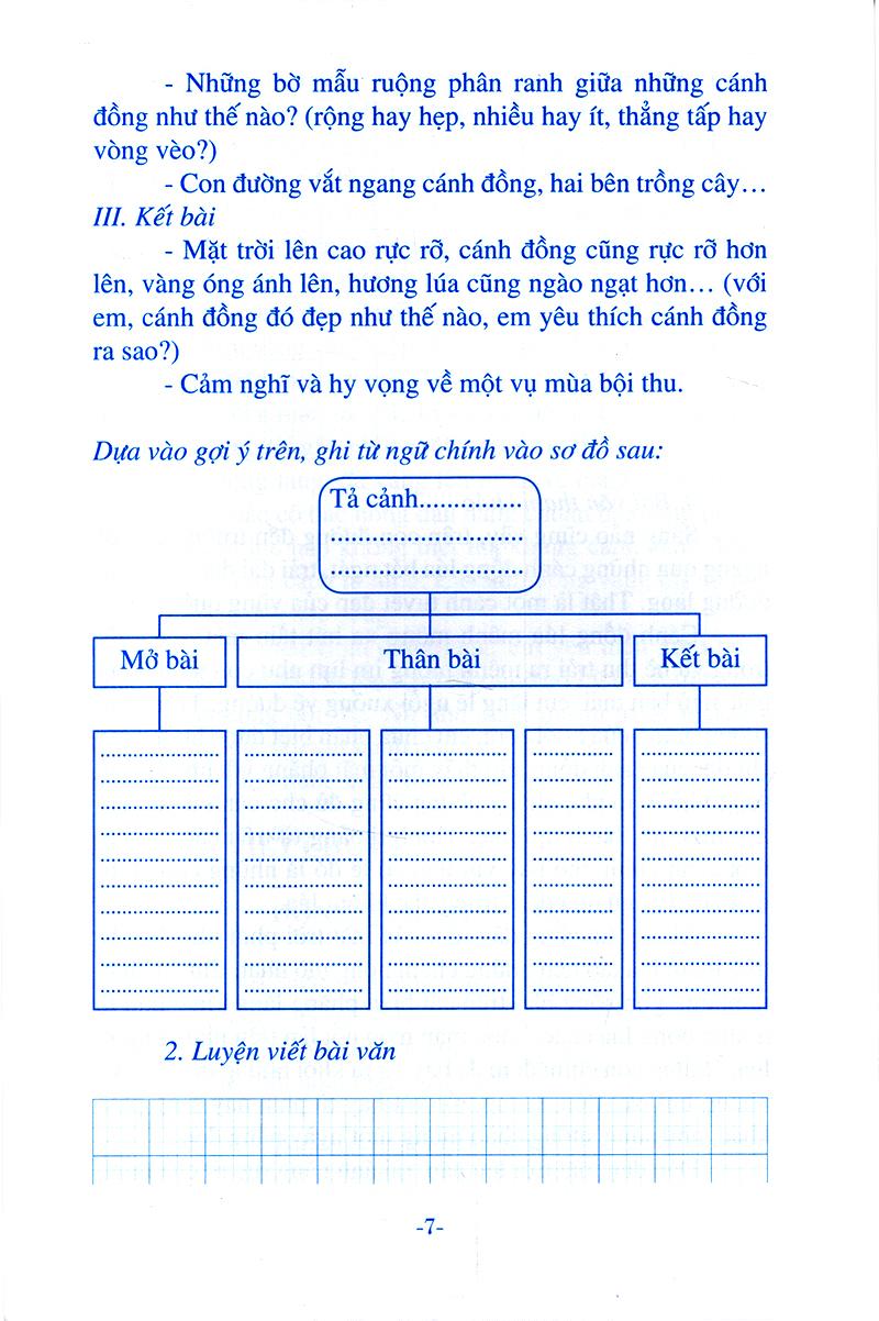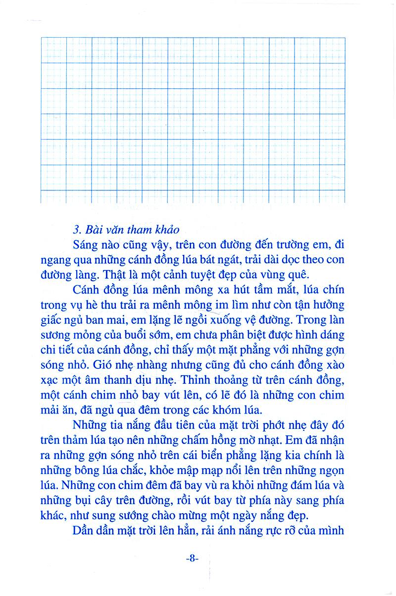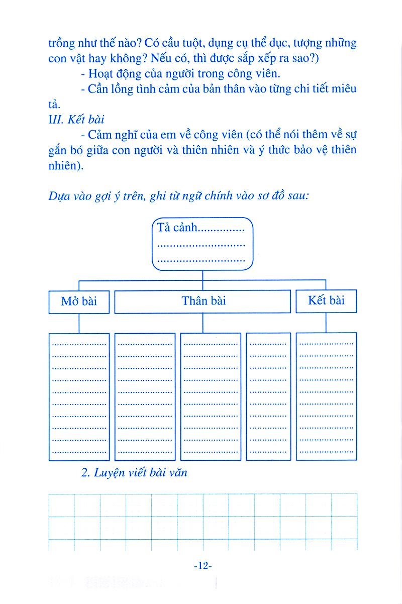 Đối với mỗi đề bài tập làm văn đều có gợi ý dàn bài chi tiết để khi làm bài văn các em viết đủ ý. Các em cần đưa thông tin chính, từ khóa vào sơ đồ sẽ giúp các em dễ nhớ, dễ tái hiện. Phần luyện viết chữ đẹp cho bài văn trên dòng kẻ ô li giúp các em cơ hội luyện, rèn chữ viết đúng mẫu. Những tiết cuối năm, các em có thể viết theo mẫu chữ sáng tạo và xem đó món quà tặng cha mẹ, thầy cô. Bài tham khảo giúp các em cơ hội bổ sung thêm ý tưởng, từ ngữ để viết hay hơn lần sau