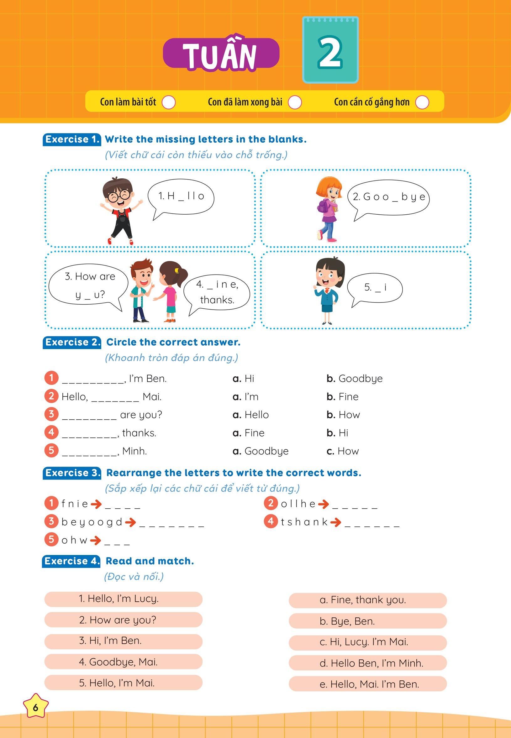 Bộ sách Phiếu bài tập cuối tuần Tiếng Anh 2 chính là tâm huyết của các thầy cô với nhiều năm kinh nghiệm giảng dạy, mong muốn các con rèn luyện và nắm vững kiến thức, tự tin bước tiếp trên con đường học tập.