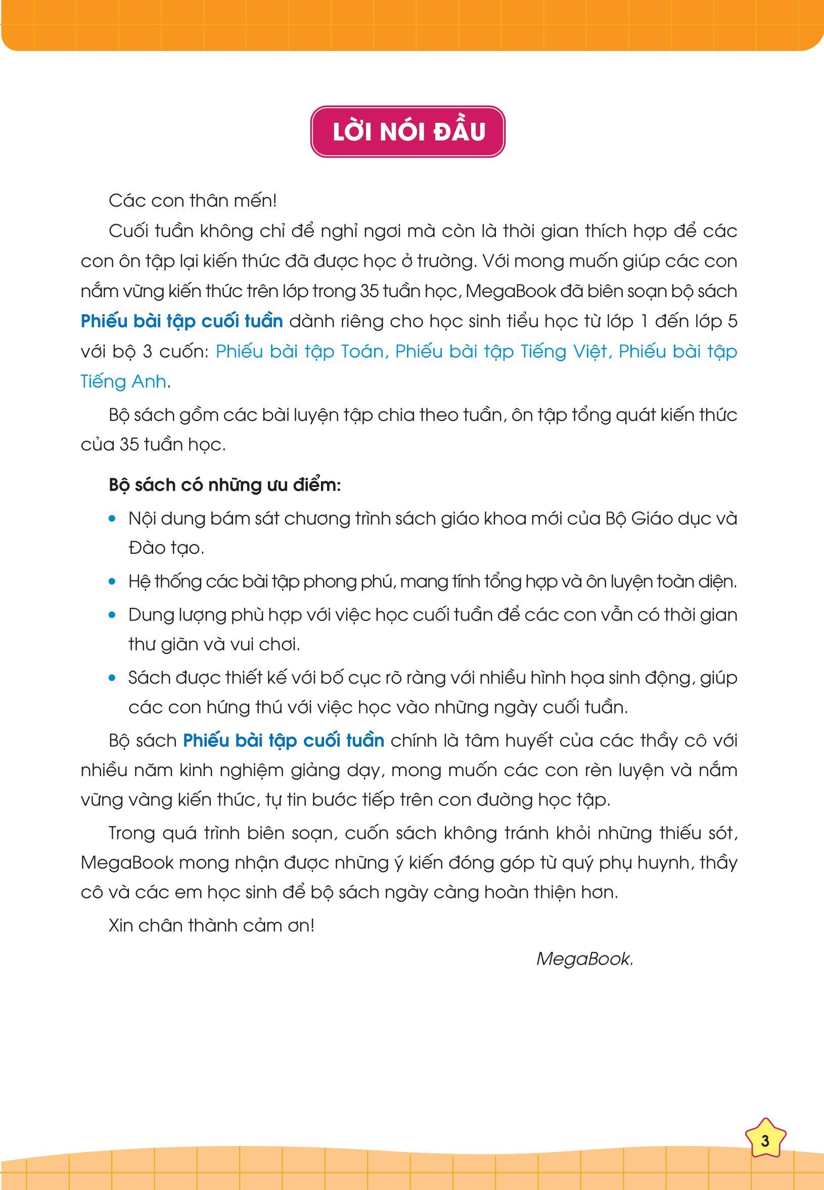 Cuối tuần không chỉ để nghỉ ngơi mà còn là thời gian thích hợp để các con ôn tập lại kiến thức đã được học ở trường. Với mong muốn giúp các con nắm vững kiến thức trên lớp trong 35 tuần học, chúng tôi đã biên soạn bộ sách Phiếu bài tập cuối tuần dành riêng cho học sinh tiểu học từ lớp 1 đến lớp 5 với bộ 3 cuốn: Phiếu bài tập Toán, Phiếu bài tập Tiếng Việt, Phiếu bài tập Tiếng Anh.