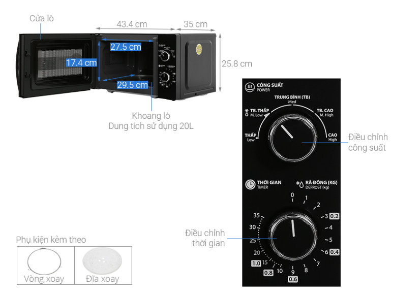[THÔNG SỐ KỸ THUẬT] Dung lượng: 20L (0.7 Cu.ft) Tiêu thụ điện (Lò vi sóng): 1050 W Kích thước bên ngoài (RxCxS): 440 x 259 x 337.5 mm Thiết kế Màu sắc: Đen