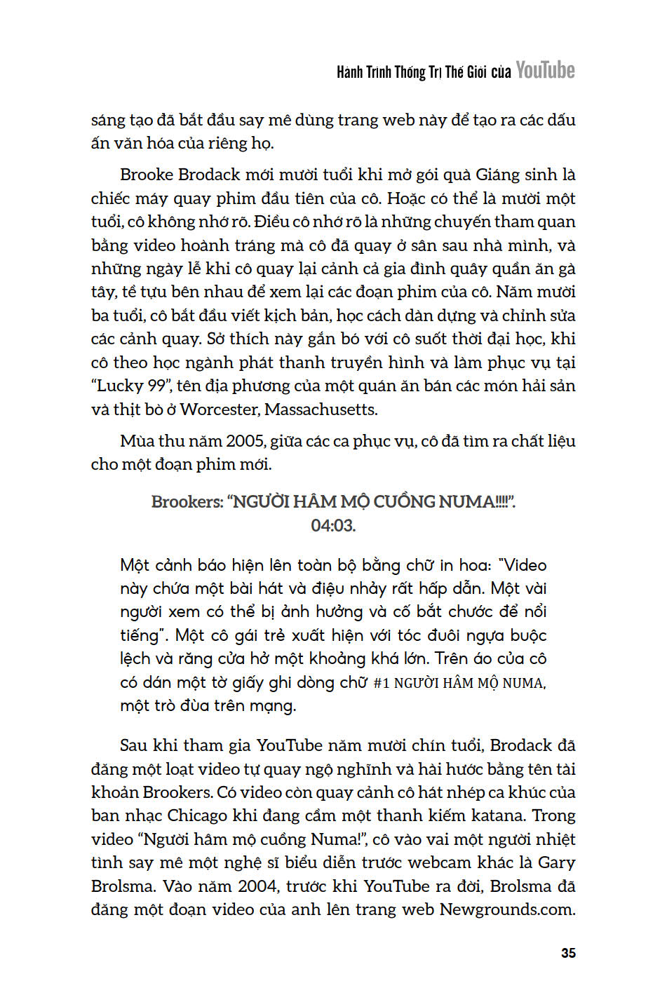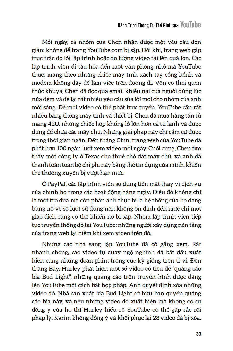 Trên khắp thế giới, mọi người xem hơn một tỷ giờ video trên YouTube mỗi ngày. YouTube đã giúp chúng ta giải trí bằng các video về mèo, nhảy flash mob, phát trực tuyến trò chơi điện tử và video “Charlie cắn ngón tay con”. YouTube đã giúp chúng ta học hỏi bằng các hướng dẫn trang điểm, làm đồ thủ công và các công thức nấu ăn ngon. YouTube đã thay đổi quan điểm của chúng ta bằng quảng cáo, chủ nghĩa cực đoan và tuyên truyền chính trị. YouTube đã phát minh ra nền kinh tế sức chú ý của thời đại mà chúng ta đang sống, làm thay đổi mãi mãi cách mọi người giải trí, cập nhật thông tin và kiếm tiền trực tuyến. Ai ai cũng biết YouTube. Nhưng ít ai hiểu nền tảng này hoạt động như thế nào. Hành trình thống trị thế giới của YouTube là quyển sách đầu tiên tiết lộ câu chuyện hậu trường hấp dẫn về công nghệ và hoạt động kinh doanh của YouTube, trình bày chi tiết cách trang web này đã giúp công ty mẹ của họ là Google đạt được quyền lực không thể tưởng tượng nổi. Đây là câu chuyện được mở ra thông qua góc nhìn của những người điều hành YouTube và những ngôi sao đã nổi tiếng nhờ nền tảng này. Đây là câu chuyện về cách mà sự tận tâm với một ý tưởng đơn giản – cho phép mọi người phát sóng trực tuyến và kiếm tiền từ việc đó – đã giải phóng một cỗ máy gây phẫn nộ và gây nghiện vượt quá tầm kiểm soát của công ty. Đây là câu chuyện về một kỳ quan công nghệ đã lật đổ các phương tiện truyền thông truyền thống, trao quyền cho những người bình thường trở thành ngôi sao và thay đổi thế giới thông qua khái niệm tự do ngôn luận. Đây cũng là câu chuyện về một tập đoàn quảng cáo tàn nhẫn đã ưu tiên tăng cường lợi ích tài chính mà ít cân nhắc đến những tác động xã hội rộng lớn hơn từ các hoạt động của mình. Hấp dẫn như chính nền tảng mà nó khám phá, Hành trình thống trị thế giới của YouTube là một bản tường thuật đầy mê hoặc qua góc nhìn của các nhân vật chủ chốt, kể về công nghệ đột phá cũng như khả năng sáng tạo của YouTube và sau cùng là về sự kiêu ngạo đã làm suy yếu mọi thành tựu của chính họ .