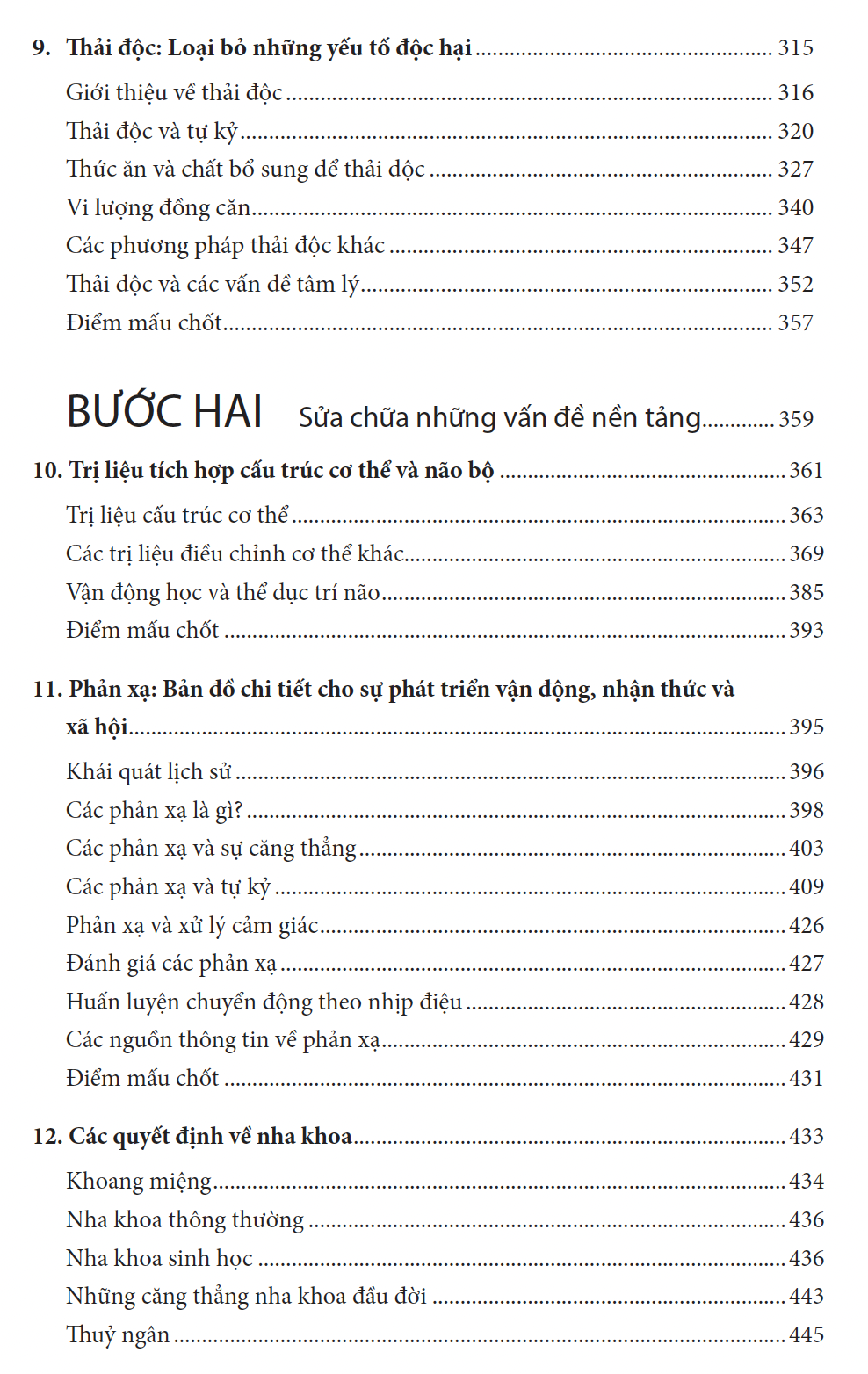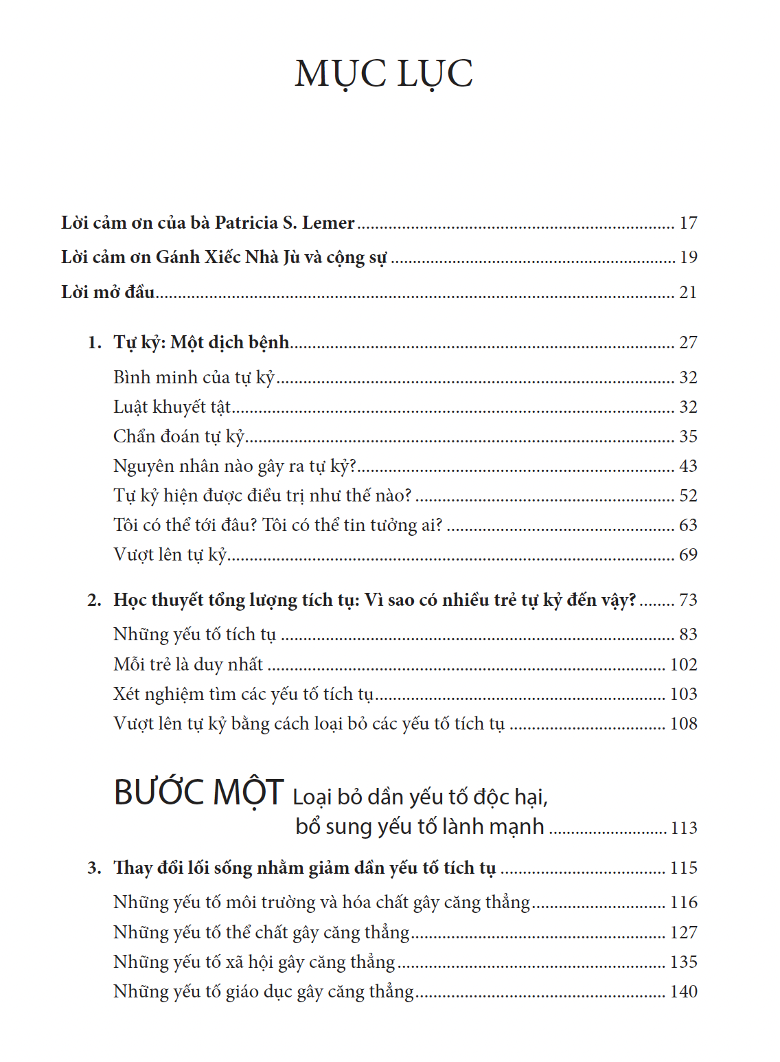 Bước 1: Loại bỏ dần yếu tố độc hại, bổ sung yếu tố lành mạnh. Trong bước này, tác giả đề xuất những giải pháp vô cùng thiết thực và khả thi, bao gồm: chuyển đổi lối sống, tập trung nâng cao sức khỏe đường ruột, áp dụng chế độ ăn phù hợp, tăng cường hệ miễn dịch & hệ nội tiết, và thải độc nhằm phục hồi thể chất cho người tự kỷ.