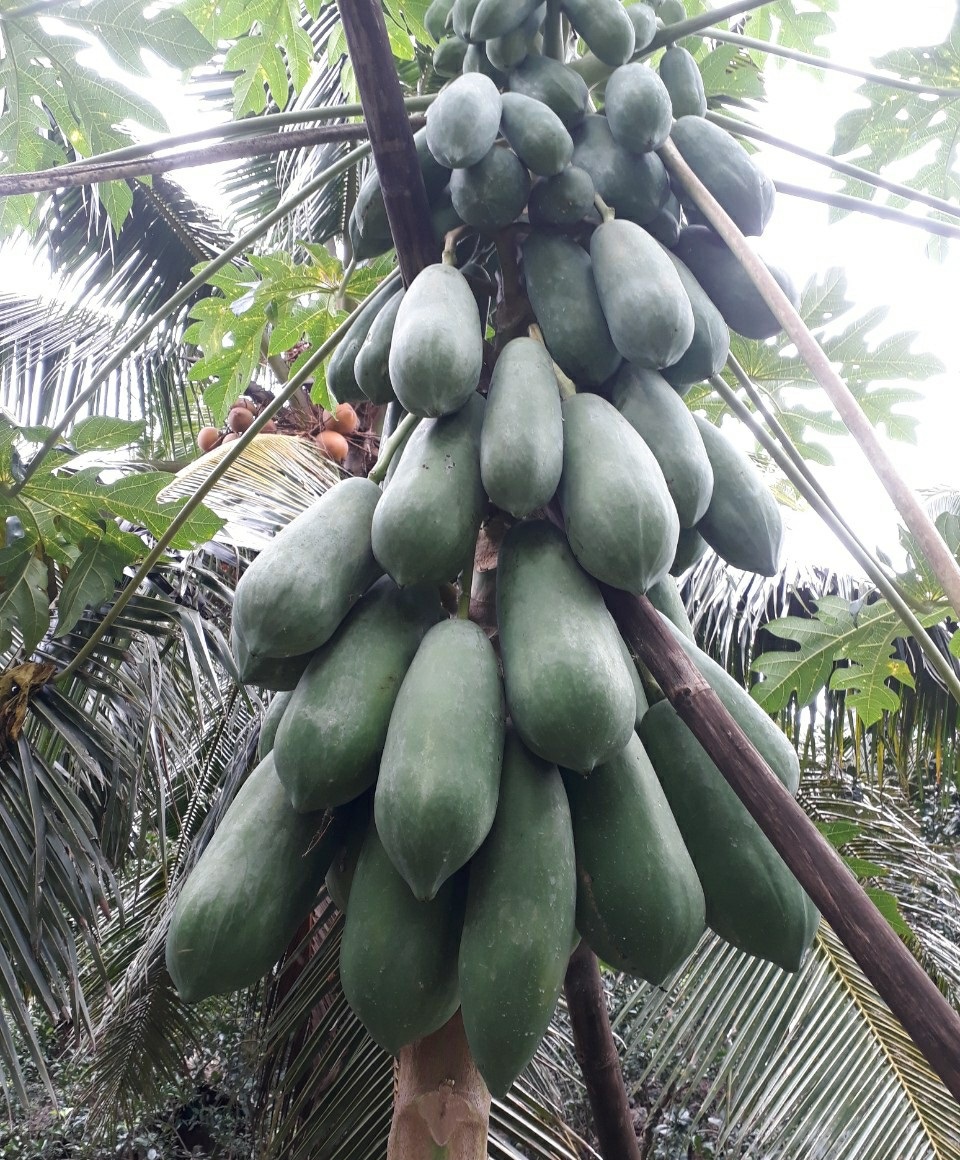 - Trồng và chăm sóc: Thời vụ trồng: Vụ xuân trồng từ tháng 3 - 4. Vụ thu trồng tháng 9 - 10. Mật độ trồng: Cây cách cây = 1,5 x 1,5m (120 cây/sào). Hố trồng: Dài, rộng, sâu = 40 x 40 x 35cm. Cách trồng: Dùng dao sắc rạch nhẹ gỡ bỏ vỏ nilon (không làm vỡ bầu). Đặt cho bầu và cây giống nằm ngang trên mặt đất xuôi theo hướng Đông - Tây. Vun đất quanh bầu. Nén chặt gốc và tưới đủ ẩm cho cây. Trồng xong dùng que cắm để nâng ngọn cây cho ngóc lên, sao cho thân gốc đu đủ luôn nghiêng một góc 45 độ so với mặt luống từ khi trồng cho đến suốt quá trình sinh trưởng của cây.