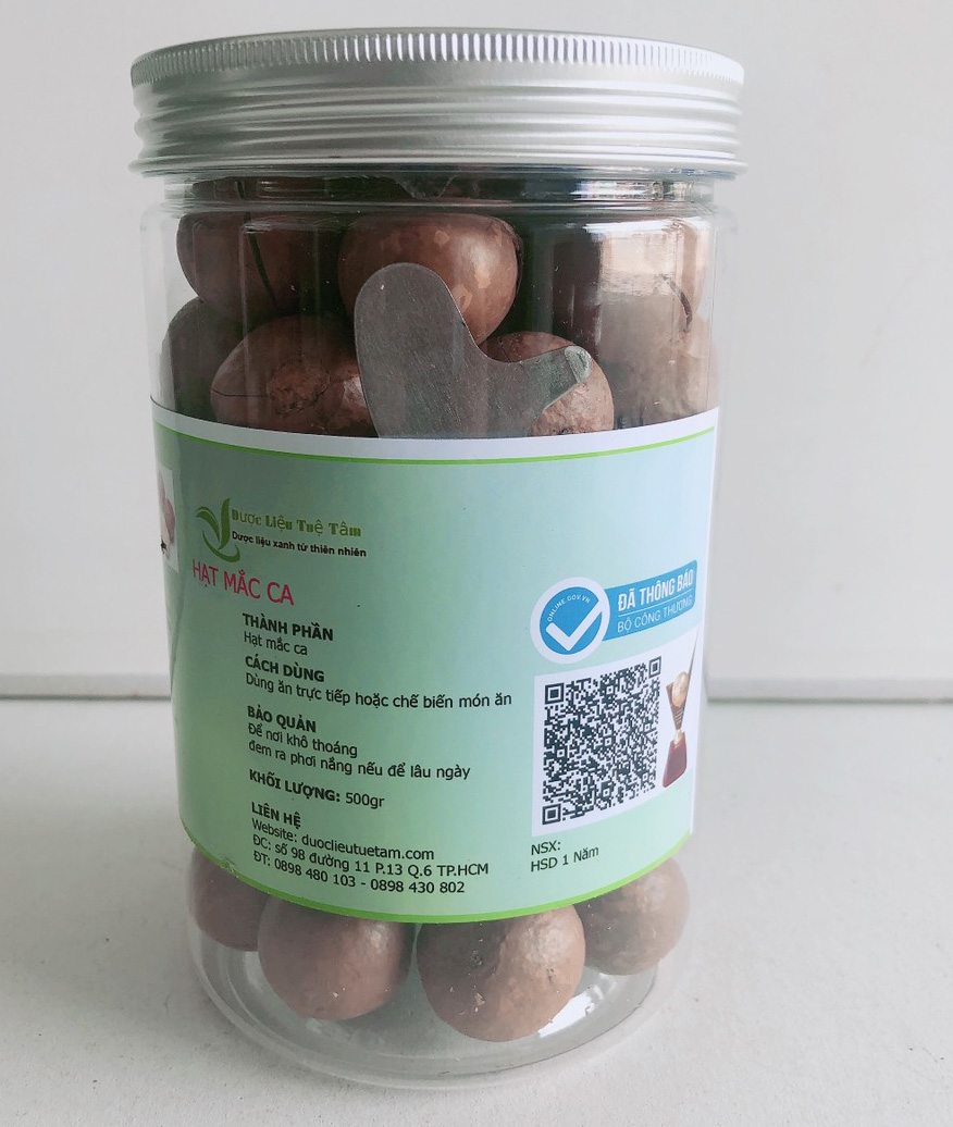 - Giá trị ẩm thực Vỏ mắc-ca có nhiều tannin và protein, dùng làm thuộc da và chế biến thức ăn chăn nuôi. Mắc-ca có vị béo, ngọt, giòn tan, trung hòa gia vị làm cho món ăn thêm đậm đà, thường được dùng để ăn sống, luộc hoặc xào nấu. Nhân mắc-ca sau khi chiên rang ăn rất ngậy, bùi, có hương vị của bơ, là một loại thực phẩm cao cấp, ngon, bổ, giàu chất béo, giàu nhiệt năng, dùng để chế biến nhân bánh, chocolate,nước uống, dầu salat… góp phần tạo nên hương sắc mới lạ và làm tăng giá trị cho món ăn Hạt mắc ca THÔNG TIN VỀ SẢN PHẨM Tên sản phẩm: hạt mắc ca Nguồn gốc: tây nguyên Đóng gói 500g cao cấp Ngày sản xuất: Ghi trên bao bì Hạn sử dụng: 1 năm