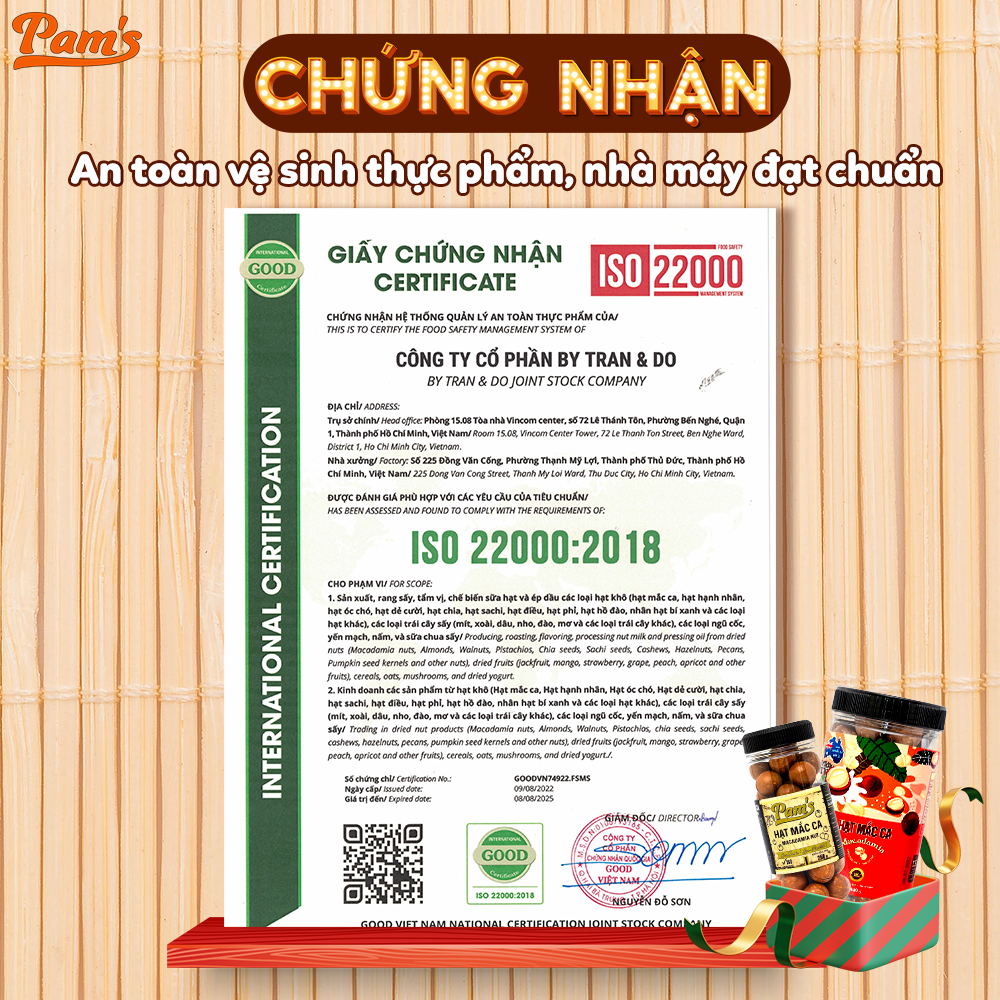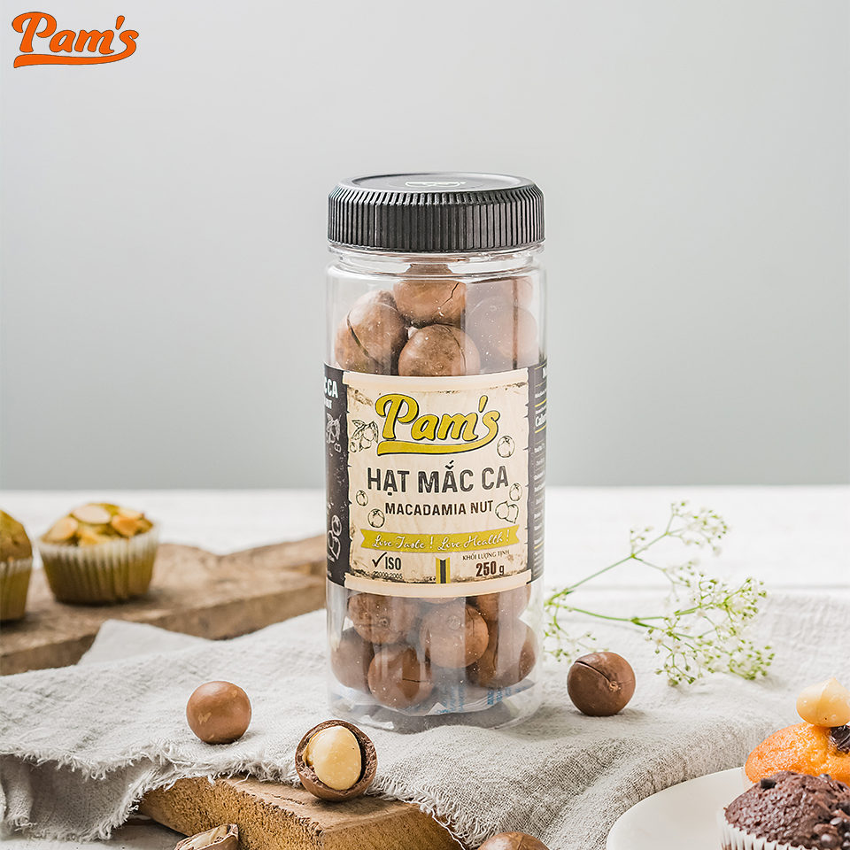 - Hạt Macca Pam's được nhập khẩu Úc chính ngạch và chế biến, đóng gói theo qui trình khép kín chuẩn ISO22000 tại Việt Nam. Hạt Macca thành phẩm đạt chất lượng cao nhất, thơm ngon, bảo toàn các giá trị dinh dưỡng và khoáng chất trong macca.