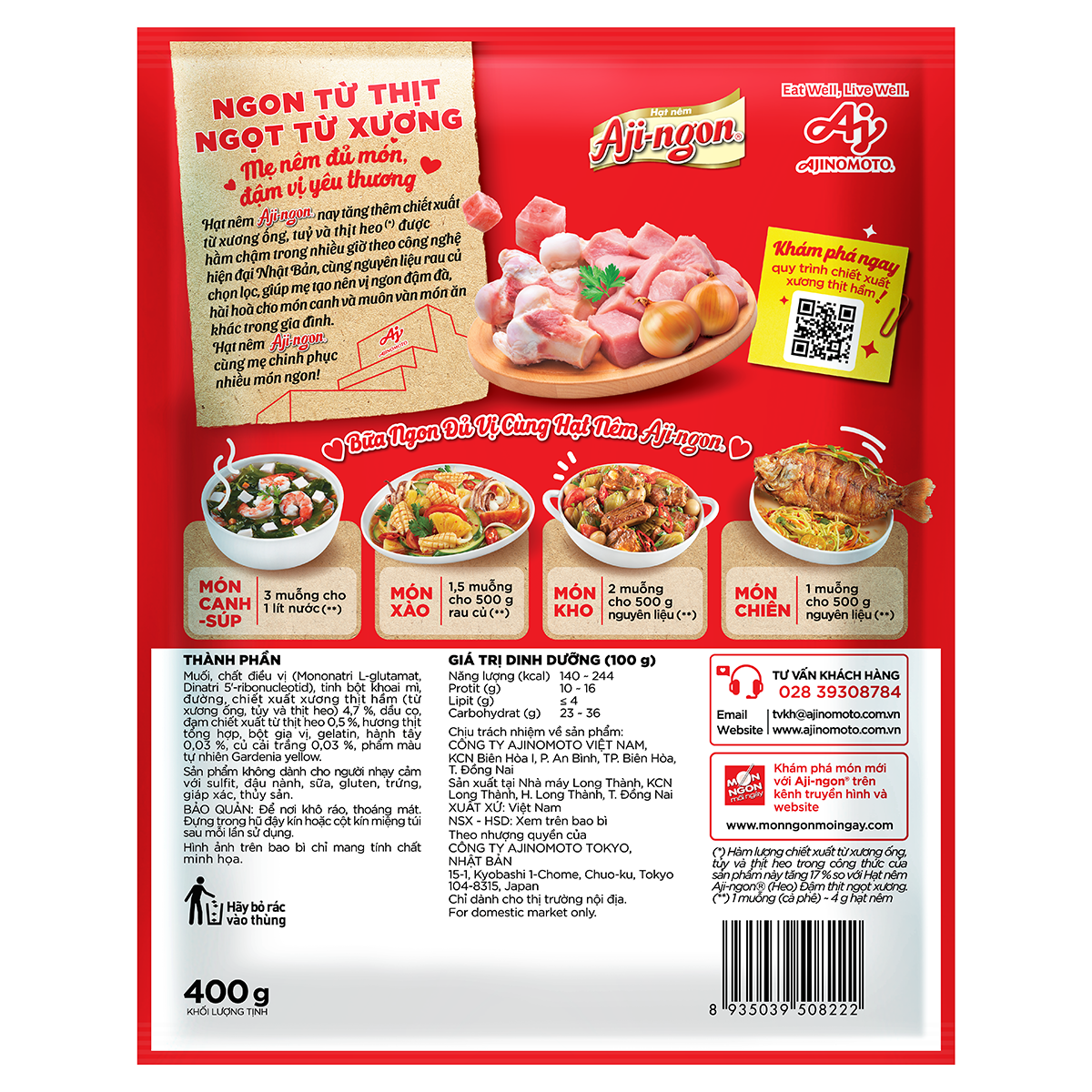 Được làm từ nước dùng của xương và thịt heo cùng với một lượng cân đối các loại gia vị khác. Hạt nêm vị heo Aji-ngon 400g là đến từ loại hạt nêm mang lại hương vị thơm ngon tự nhiên cho món ăn của gia đình bạn. Hạt nêm Aji-ngon gói nhỏ phù hợp nhu cầu sử dụng gia đình và dễ mang đi. Hạt nêm Xương, thịt heo Aji-ngon gói 400g được làm từ thịt và xương heo nguyên chất theo công nghệ tiên tiến của Nhật Bản. Với công thức "Đậm xương thịt, thêm đậm đà", hạt nêm Aji-ngon giúp cho các món ăn thêm đậm vị, thơm ngon. Ngoài ra, hạt nêm được bổ sung canxi theo dự án hợp tác với Hội Dinh dưỡng Việt Nam. Khi sử dụng 3 muỗng hạt nêm Aji-ngon, bạn đã cung cấp thêm 100mg canxi, giúp cải thiện sức khỏe gia đình. Hướng dẫn sử dụng: