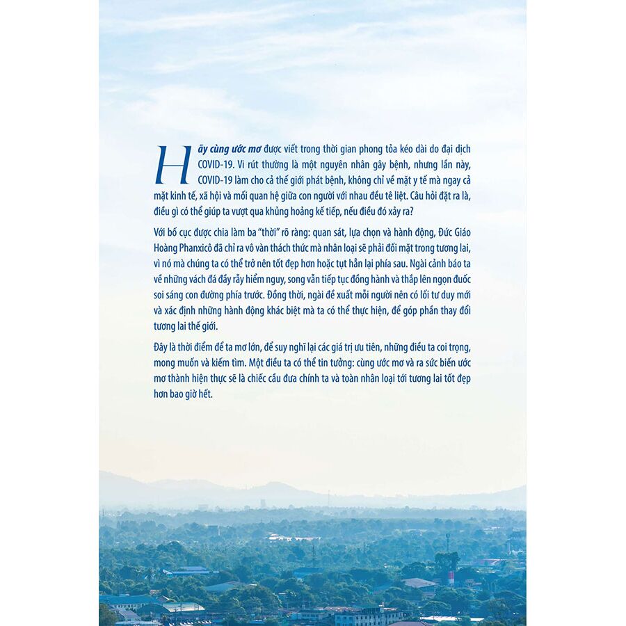 Hãy Cùng Ước Mơ được viết trong thời gian phong tỏa kéo dài do đại dịch COVID-19. Vi rút thường là một nguyên nhân gây bệnh, nhưng lần này, COVID-19 làm cho cả thế giới phát bệnh, không chỉ về mặt y tế mà ngay cả mặt kinh tế, xã hội và mối quan hệ giữa con người với nhau đều tê liệt. Câu hỏi đặt ra là, điều gì có thể giúp ta vượt qua khủng hoảng kế tiếp, nếu điều đó xảy ra? Với bố cục được chia làm ba “thời” rõ ràng: quan sát, lựa chọn, và hành động, Đức Giáo hoàng Phanxicô đã chỉ ra vô vàn thách thức mà nhân loại sẽ phải đối mặt trong tương lai, vì nó mà chúng ta có thể trở nên tốt đẹp hơn hoặc tụt hẳn lại phía sau. Ngài cảnh báo ta về những vách đá đầy rẫy hiểm nguy, song vẫn tiếp tục đồng hành và thắp lên ngọn đuốc soi sáng con đường phía trước. Đồng thời, ngài đề xuất mỗi người nên có lối tư duy mới và xác định những hành động khác biệt mà ta có thể thực hiện, để góp phần thay đổi tương lai thế giới. Đây là thời điểm để ta mơ lớn, để suy nghĩ lại các giá trị ưu tiên, những điều ta coi trọng, mong muốn và kiếm tìm. Một điều ta có thể tin tưởng: cùng ước mơ và ra sức biến ước mơ thành hiện thực sẽ là chiếc cầu đưa chính ta và toàn nhân loại tới tương lai tốt đẹp hơn bao giờ hết. “Từ cuộc khủng hoảng này, chúng ta có thể trở nên tốt hơn hoặc tệ đi. Ta có thể trượt dài về sau, hoặc có thể tạo ra điều gì đó mới mẻ. Hiện tại, điều ta cần là cơ hội để thay đổi và tạo không gian cho những điều mới.” “Đây là thời điểm để ta mơ lớn, để suy nghĩ lại các giá trị ưu tiên, những điều ta coi trọng, mong muốn và kiếm tìm, và cũng để cam kết hành động trong mỗi ngày sống vì những điều ta mơ ước.”