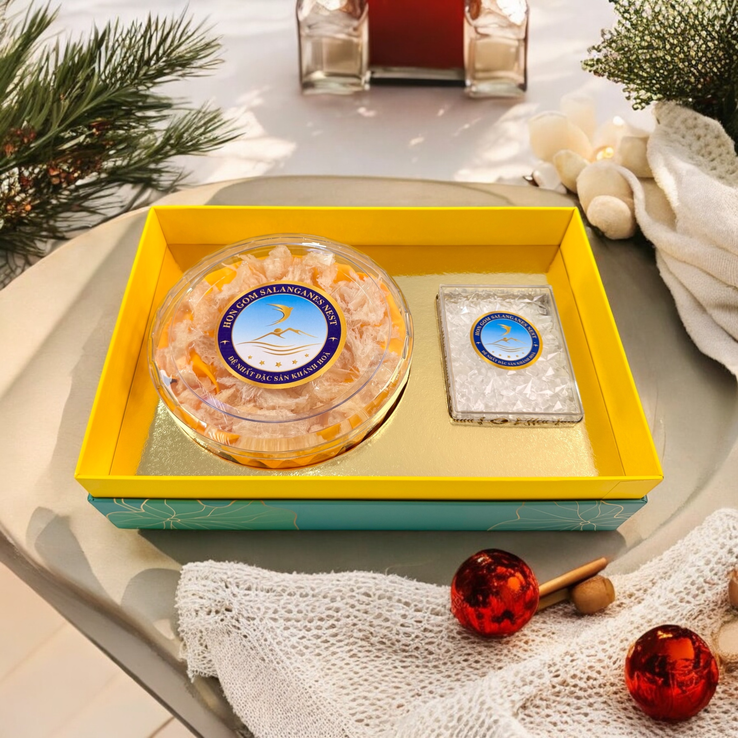 Hộp giấy chữ nhật kích thước 23x28x6 (cm) Gồm 2 hộp, mỗi hộp gồm 60 phần yến, mỗi phần 1,5 g + 60 gói đường phèn, mỗi gói 7 g 100% yến nguyên chất, KHÔNG