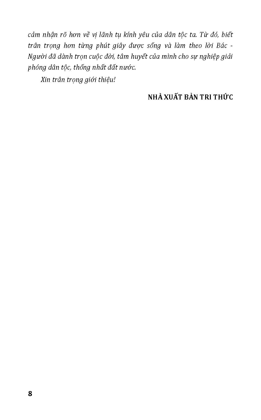 Sách nói về vị lãnh tụ kính yêu của dân tộc dưới góc nhìn gần gũi, thân thương. Mặc dù bám theo trình tự biên niên, sách vẫn cố gắng tổ chức theo các lĩnh