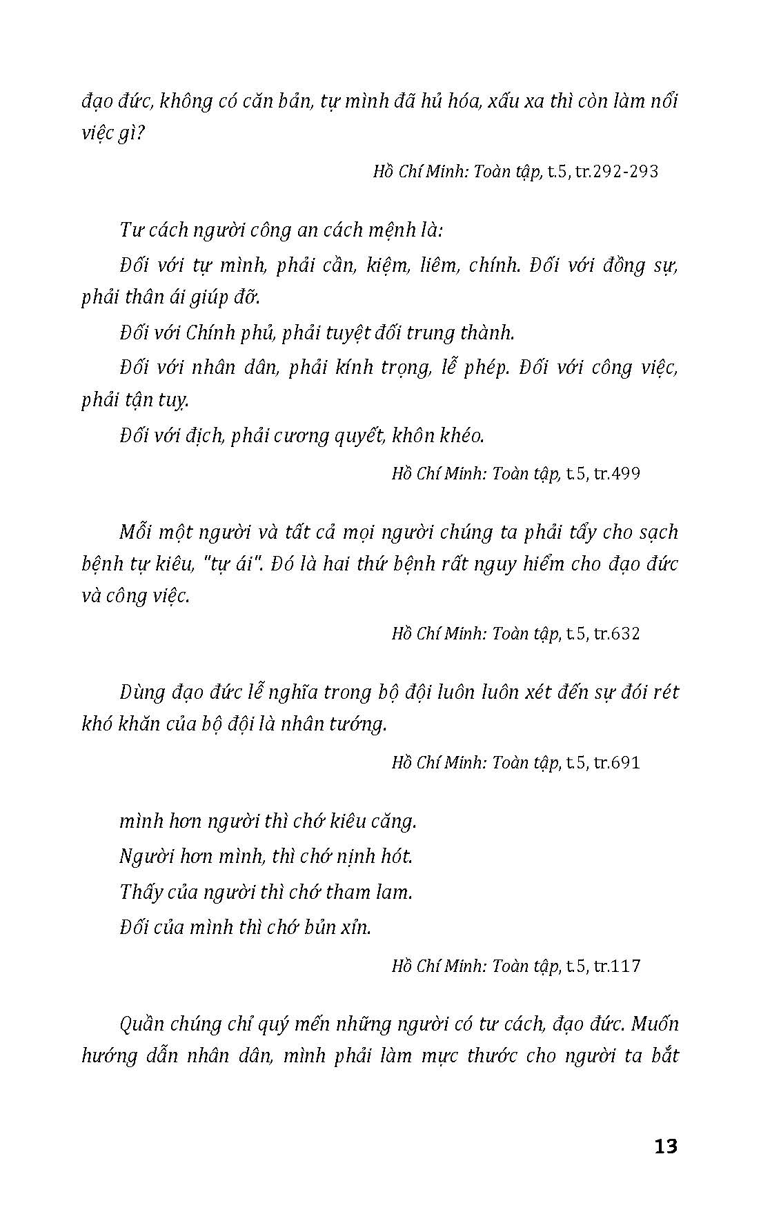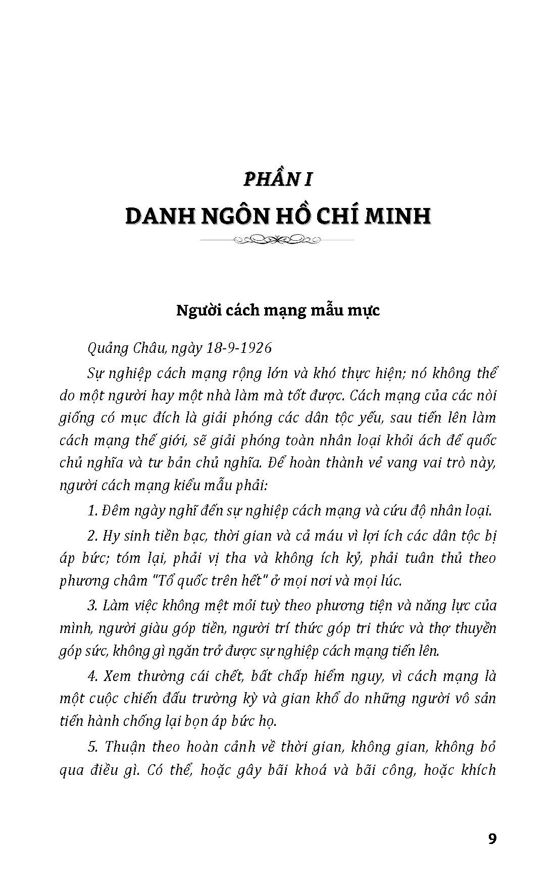 Chí khí cách mạng kiên cường, tinh thần độc lập tự chủ, lòng yêu nước, yêu nhân dân tha thiết, cùng đạo đức cần, kiệm, liêm, chính, chí công vô tư, khiêm tốn và giản