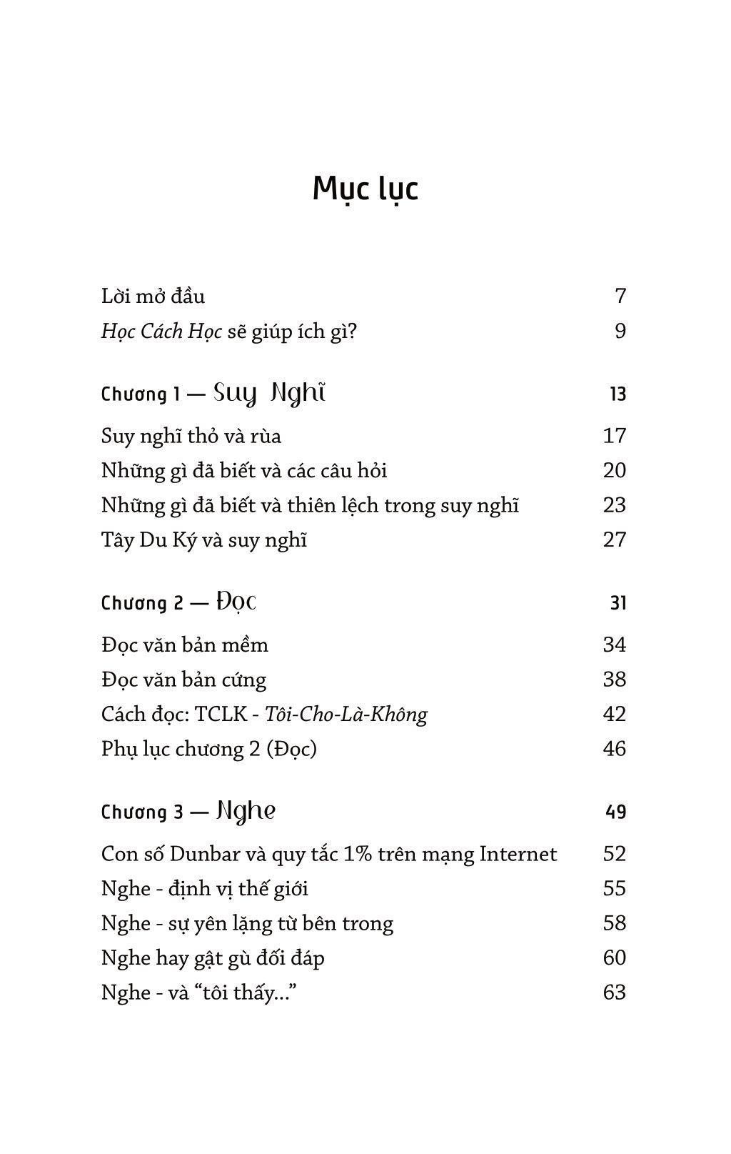 Học Cách Học sẽ đưa ra một cách nhìn, cách học và cách suy ngẫm khi tương tác với kiến thức. Mục đích này gắn với triết lý đi đường của việc học. Khi học, giống như đi trên một con đường -- mỗi trang sách, mỗi sự hiểu biết và mỗi trải nghiệm mới sẽ khiến cây cối thay đổi, nhà cửa xuất hiện, chim hót, mây