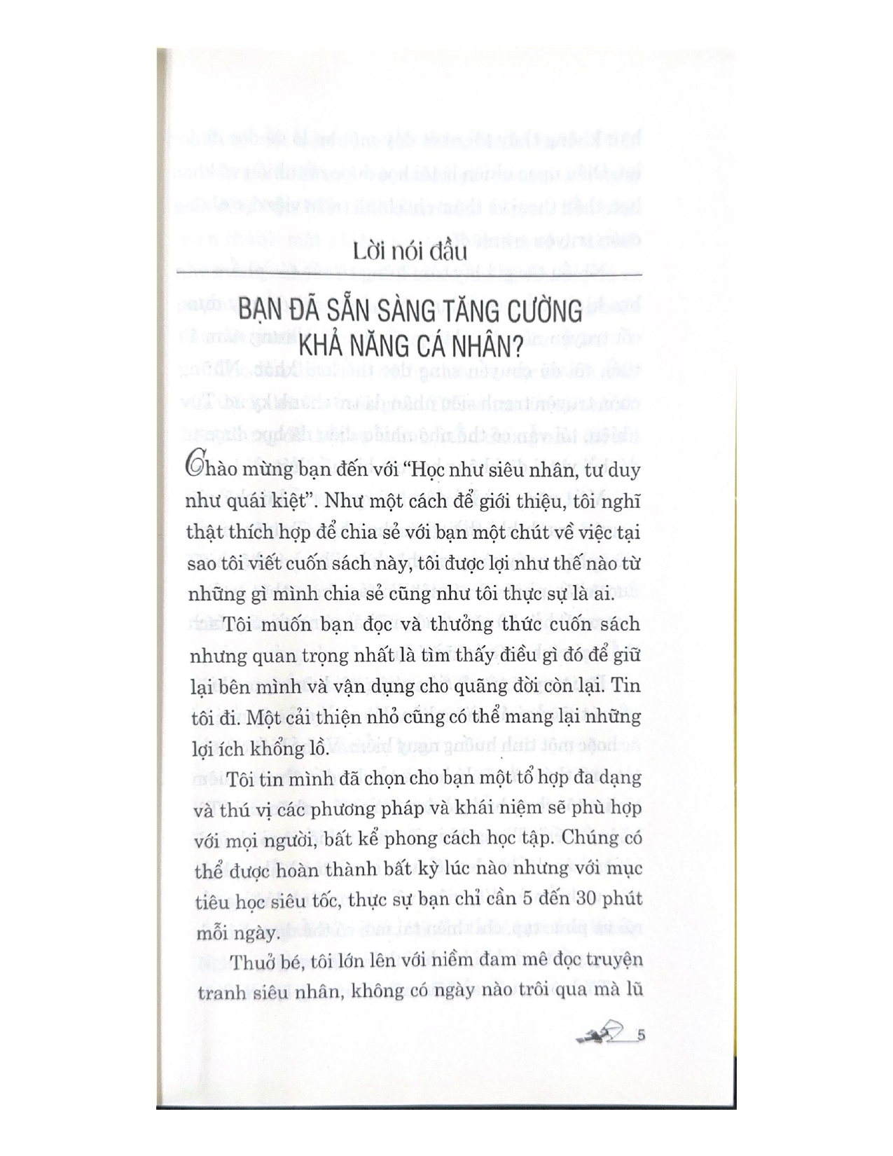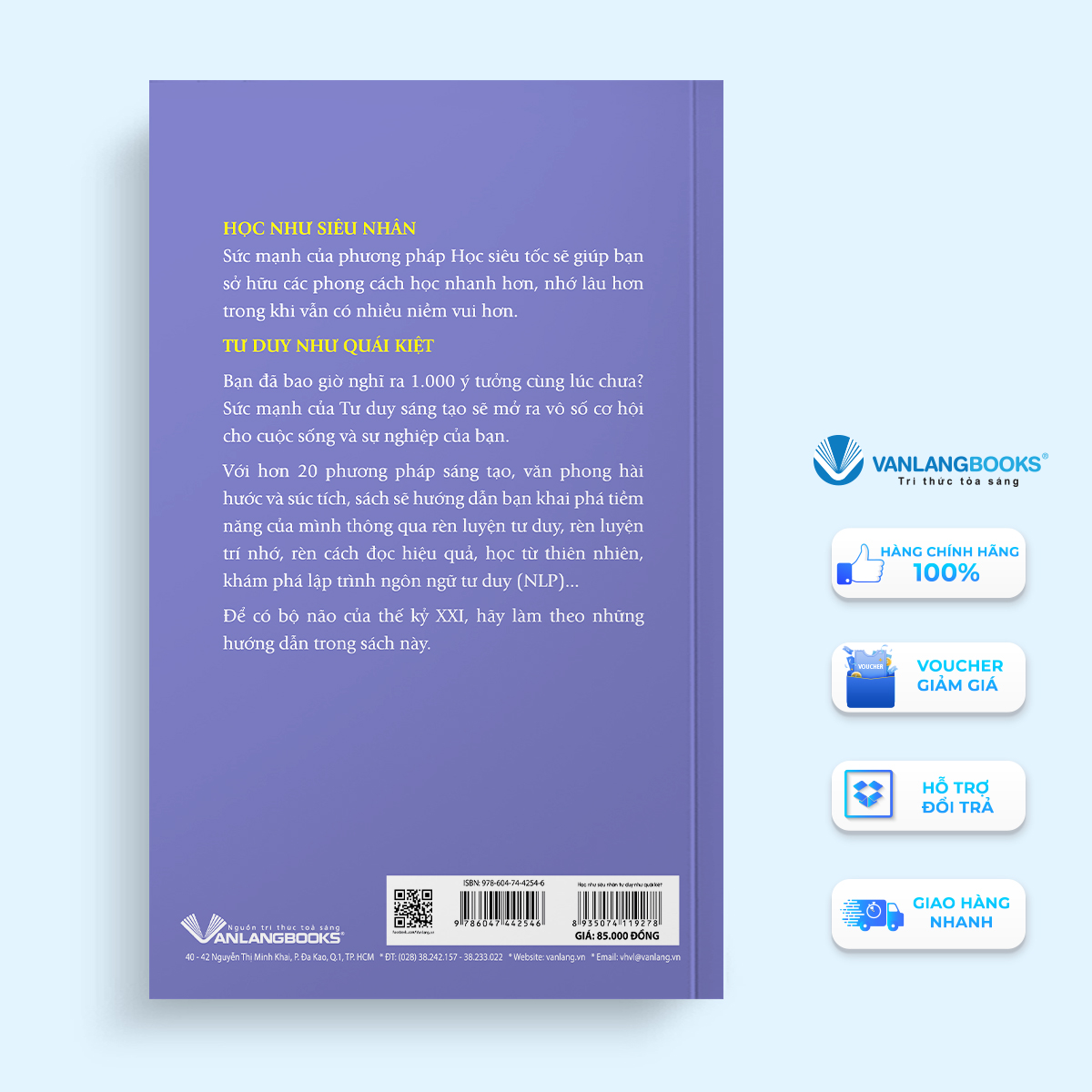 - Giới thiệu Học như siêu nhân Một cuốn sách Học như siêu nhân tư duy quái kiệt hướng dẫn dễ hiểu nhằm tăng cường khả năng học với sức mạnh của phương pháp Học Siêu tốc, giúp bạn sở hữu các phong cách học nhanh hơn, nhớ lâu hơn trong khi có nhiều niềm vui hơn. Tư duy như quái kiệt Bạn đã bao giờ muốn có 1.000 kg ý tưởng chưa? Với sức mạnh của Tư duy sáng tạo, không chỉ vô số cơ hội mở ra mà toàn thể Vũ trụ cũng mở ra cho bạn. Với hơn 20 phương pháp sáng tạo, văn phong hài hước và súc tích, Học như siêu nhân, tư duy như quái kiệt sẽ hướng dẫn bạn khai phá tiềm năng của mình thông qua rèn luyện tư duy,nhà sách online rèn luyện trí nhớ, rèn cách đọc hiệu quả, học từ thiên nhiên, khám phá lập trình ngôn ngữ tư duy (NLP)… Để có bộ não của thế kỷ XXI, hãy làm theo những hướng dẫn này.