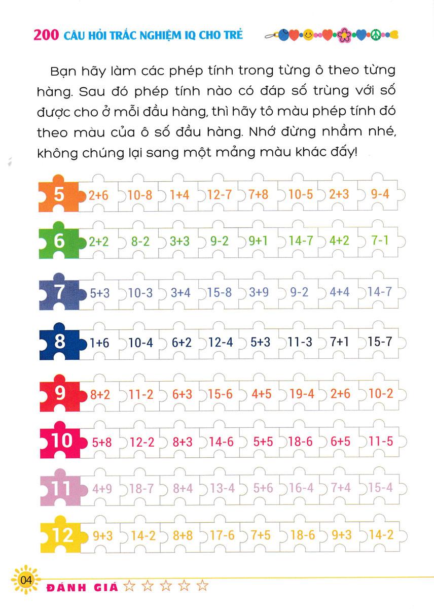 200 Câu hỏi IQ cho trẻ bao gồm những bài tập hữu ích cho việc cải thiện tư duy suy luận logic tăng cường khả năng giao tiếp phân tích thông tin của trẻ, bạn sẽ tìm thấy nhiều dạng bài tập vừa thú vị vừa đòi hỏi sự động não để hỗ trợ phát triển trí óc tư duy cho trẻ một cách hiệu quả.