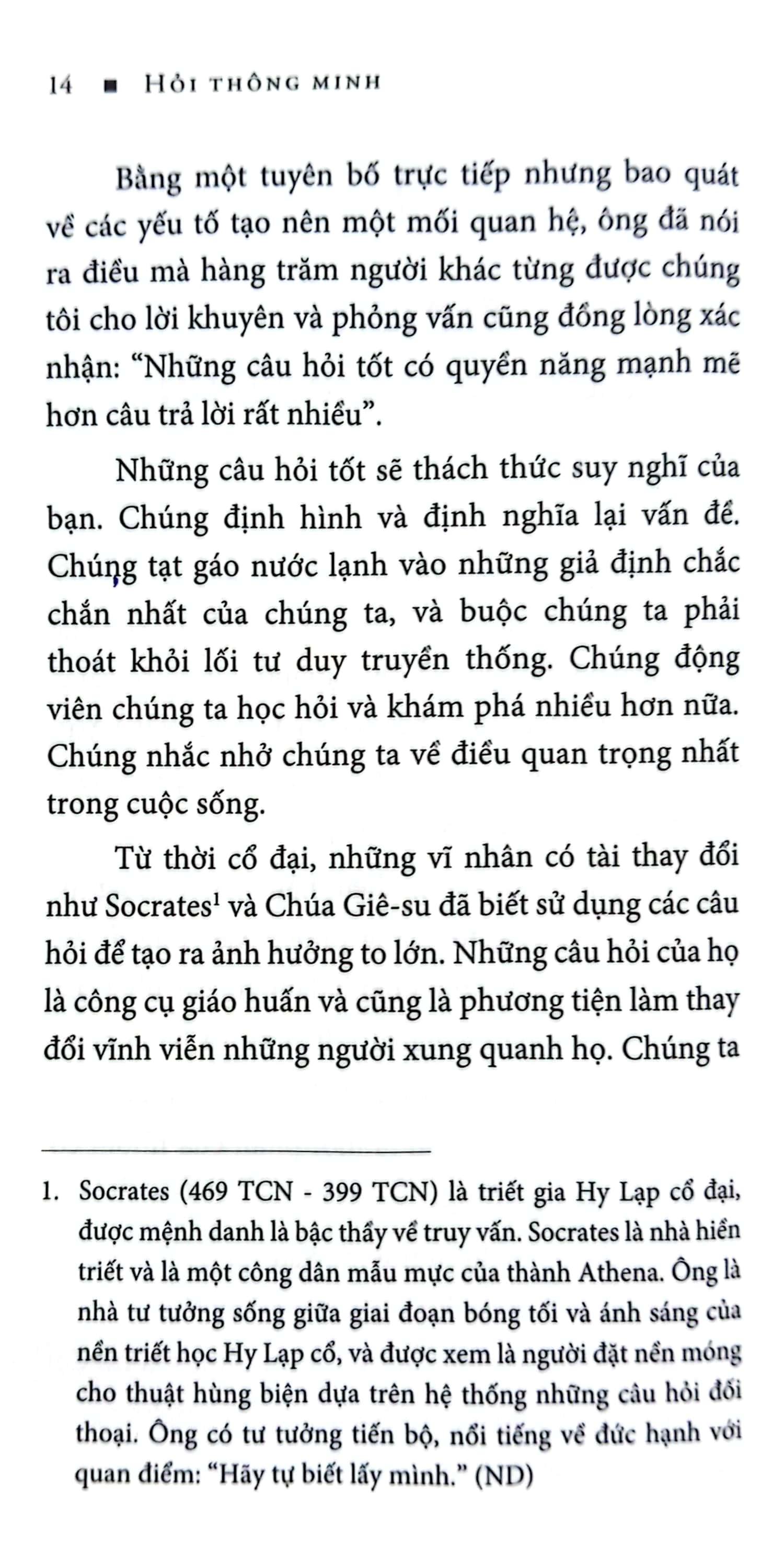 Hỏi Thông Minh - Đáp Cực Đỉnh Chúng ta đều cố gắng xây dựng những mối quan hệ đích thực với khách hàng, bạn bè và gia đình. Nhưng đôi khi chúng ta vẫn bị bế tắc và lúng túng. Hỏi thông minh, đáp cực đỉnh sẽ giúp bạn giải quyết tất tật những vấn đề đó bằng cách sử dụng các câu hỏi để thêm gia vị và ý nghĩa cho các cuộc trò chuyện, cũng như thắt chặt hơn các mối quan hệ. Giúp bạn làm được những việc sau một cách thật dễ dàng: