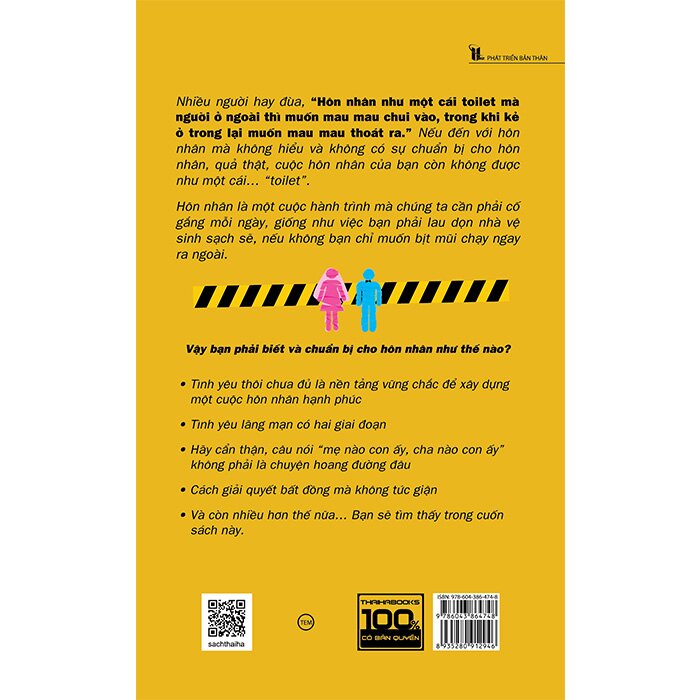 Với những cặp đôi đã kết hôn, cuốn sách này sẽ giúp bạn kiểm tra lại nền tảng và những kỹ năng cần thiết để xây dựng một cuộc hôn nhân hạnh phúc. Đây không chỉ là cuốn sách đơn giản để đọc. Đây là cuốn sách để trải nghiệm. Bạn phải trăn trở với những tình huống thực tế được thảo luận trong cuốn sách này và ứng dụng vào chính cuộc hôn nhân hay mối quan hệ của mình. Nếu bạn bỏ qua những vấn đề này và cho rằng cảm giác phấn khích mà bạn có trong thời gian yêu sẽ theo bạn suốt cuộc đời, thì bạn đã tự đưa ra thất bại cho chính mình. Hãy nhớ đám cưới chỉ là điểm bắt đầu và đừng để cuộc hôn nhân của bạn biến thành cái toilet - nơi mà người bên ngoài thì muốn vào còn người bên trong thì muốn mau mau chóng chóng đi ra.