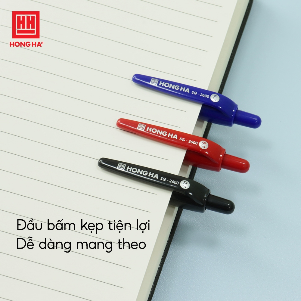 - Bước 3: Cầm bút nghiêng 45 độ so với mặt giấy để mực chảy đều và viết thuận lợi hơn. Sau khi sử dụng: Ấn lại nút bấm trên đầu bút đảm bảo giữ ngòi bút nằm trong cổ bút, tránh bị dây mực. Cách bảo quản Khi viết, không ấn ngòi bút quá mạnh. Ấn nút bấm thu đầu bi sau khi sử dụng, tránh bị dây mực và ảnh hưởng đến đầu bi. Để ở nơi có nhiệt độ thường, tránh để bút tiếp xúc trực tiếp với lửa vì lửa có thể làm nóng chảy, biến dạng bút. Tránh làm rơi và đè vật nặng lên bút. Sở hữu những ưu điểm vượt trội trên, bút Semi Gel Hồng Hà 0.7mm 2600 chính là người bạn đồng hành thân thiết của mỗi khách hàng trong quá trình học tập, thi cử và làm việc. HỒNG HÀ – 62 NĂM XÂY DỰNG VÀ PHÁT TRIỂN Công ty CP Văn phòng phẩm Hồng Hà được thành lập vào ngày 1/10/1959, trải qua 62 năm trưởng thành và phát triển, thương hiệu Văn phòng phẩm Hồng Hà đã để lại dấu ấn sâu đậm trong tâm trí nhiều thế hệ người tiêu dùng Việt Nam với những sản phẩm như bút Trường Sơn, Hoàn Kiếm, Hồng Hà… Với phương châm sản xuất những sản phẩm chất lượng tốt nhất phục vụ người tiêu dùng, Công ty CP Văn phòng phẩm Hồng Hà luôn không ngừng nỗ lực mang đến cho khách hàng những sản phẩm vượt trội, thân thiện với môi trường và an toàn cho sức khỏe. Hiện tại, số lượng sản phẩm mang thương hiệu Hồng Hà đã lên tới hàng ngàn sản phẩm và được chia thành 10 ngành hàng chính: – Vở viết – Sổ – Bút – Dụng cụ học sinh – Xuất bản phẩm – Họa phẩm – Đồ dùng văn phòng – Ba lô, túi cặp – Đồ chơi thông minh – Vải không dệt " CẦN VĂN PHÒNG PHẨM, ĐÃ CÓ HỒNG HÀ"