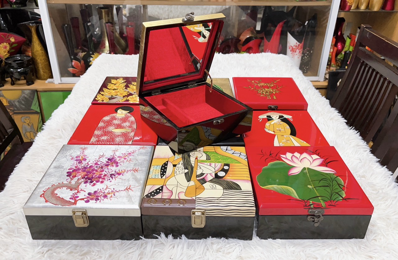 Hộp sơn mài - Hàng thủ công mỹ nghệ Việt Nam được các nghệ nhân tạo hình độc đáo, kết hợp chất liệu gần gũi, quen thuộc và đặc trưng của Việt nam mang đến tính nghệ thuật và thẩm mỹ cao cho tổng thể sản phẩm. Họa tiết được vẽ rồi mài nhiều lần tới khi đạt hiệu quả mà họa sĩ mong muốn. Sau cùng là đánh bóng tranh. Để ra đời một sản phẩm, người thợ phải kiên trì với phương pháp thủ công, thậm chí hàng tháng trời với tất cả sự công phu, cầu kỳ, điêu luyện. ️