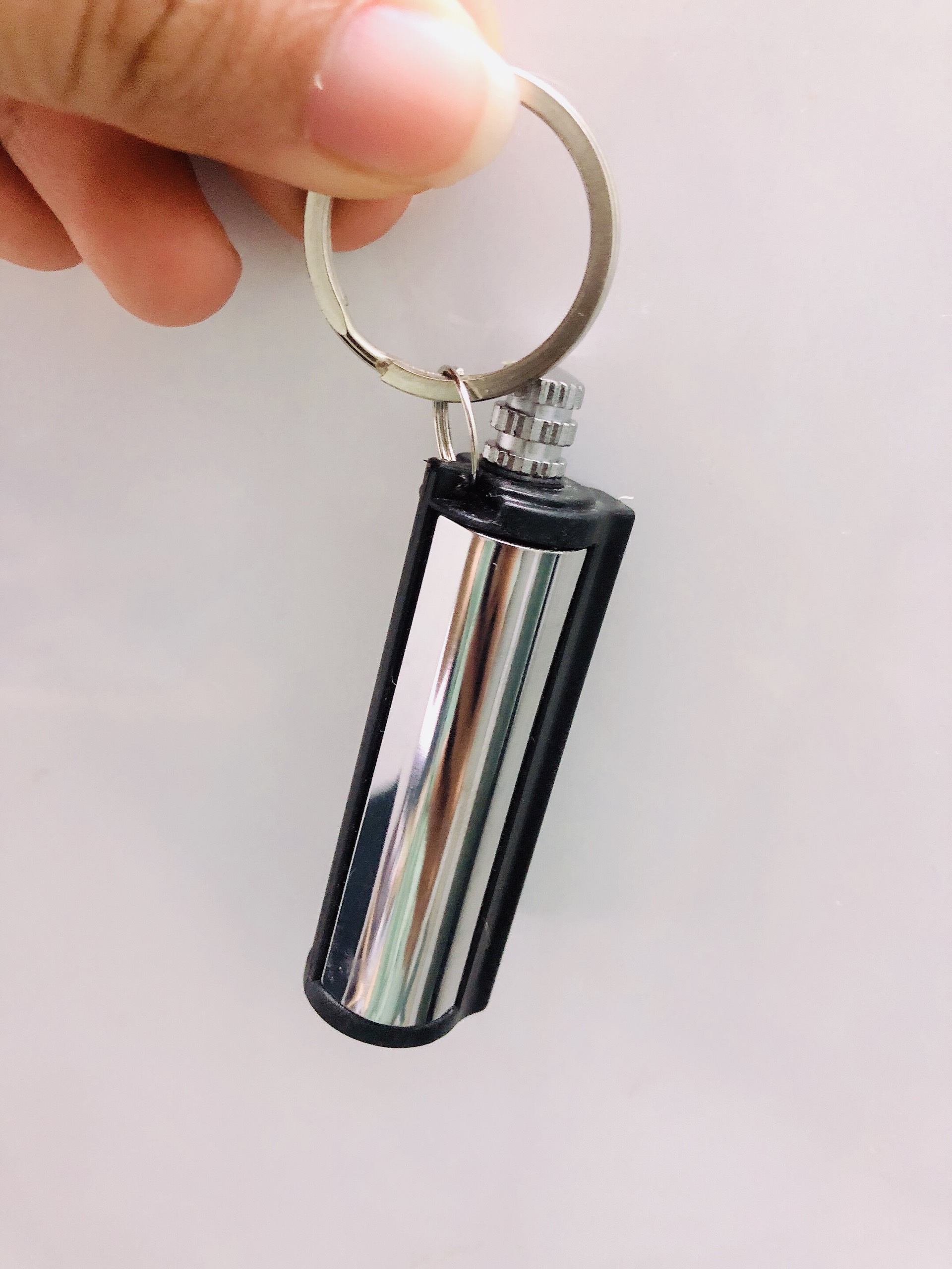 Hột quẹt bật lửa móc khóa diêm xăng sinh tồn hình Trụ Tròn - xài xăng - Nguyên liệu: kim loại nguyên khối – Kích thước: Chiều cao: 5 cm, Chiều rộng: 1.3 cm –