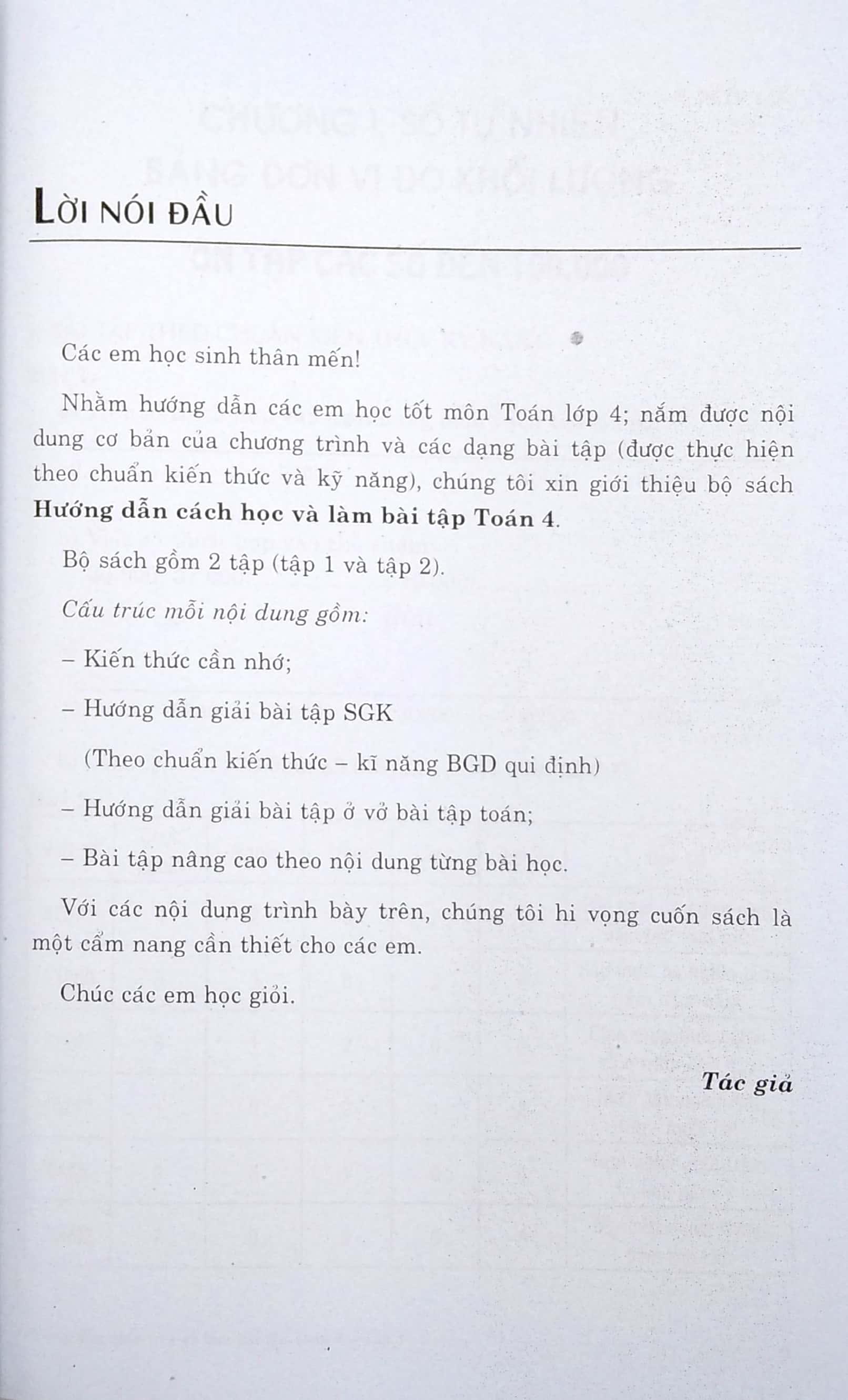 Hướng Dẫn Cách Học Và Làm Bài Tập Toán 4 - Tập 1 Các em học sinh thân mến! Nhằm hướng dẫn các em học tốt môn Toán lớp 4; nắm được nội dung cơ bản của chương trình và các dạng bài tập (được thực hiện theo chuẩn kiến thức và kỹ năng), chúng tôi xin giới thiệu bộ sách Hướng dẫn cách học và làm bài tập Toán 4.. Bộ sách gồm 2 tập (tập 1 và tập 2). Cấu trúc mỗi nội dung gồm: