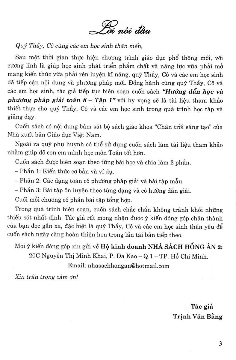 Sau một thời gian thực hiện chương trình giáo dục phổ thông mới, với cương lĩnh là giúp học sinh phát triển phẩm chất và năng lực vừa phải mở mang kiến thức vừa phải rèn luyện kĩ năng, quý Thầy, Cô và các em học sinh đã tiếp cận nội dung và phương pháp mới. Đồng hành cùng quý Thầy, Cô và các em học sinh, tác giả tiếp tục biên soạn cuốn sách “Hướng dẫn học và phương pháp giải toán 8 – Tập 1” với hy vọng sẽ là tài liệu tham khảo thiết thực cho quý Thầy, Cô và các em học sinh trong quá trình học tập và giảng dạy.