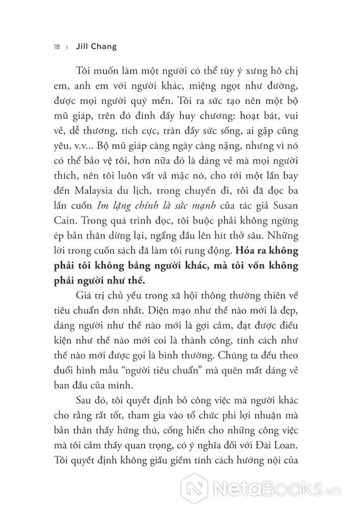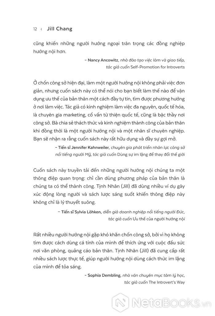 IM LẶNG LÀ SIÊU SỨC MẠNH Không nhiều lời, nhưng mọi người đều lắng nghe bạn Người hướng nội có thể thành công trong các nền văn hóa, ở các nơi làm việc khác nhau, Tịnh Nhân (Jill) chính là một ví dụ tuyệt vời. Cuốn sách hữu ích này của bà sẽ dẫn dắt độc giả vào cuộc cách mạng im lặng của người hướng nội. Từ nhiều ví dụ thực tế, Tịnh Nhân (Jill) cho thấy người hướng nội làm cách nào là chính mình, phát huy sở trường để có thể tỏa sáng nơi làm việc, trở thành tài sản tuyệt vời của công ty. Đây là cuốn sách hay mà các chiến sĩ im lặng chốn công sở hiện đại cần đọc. – Susan Cain, người sáng lập công ty Cách mạng Im lặng, tác giả cuốn Im lặng chính là sức mạnh Sách của Tịnh Nhân (Jill) đem lại sự tự tin và sức mạnh cho những người im lặng, có tư duy chu toàn nhưng đôi lúc bị đánh giá thấp một cách thiếu công bằng. Là một người hướng nội, bà cho thấy người hướng nội có thể đem lại ưu thế và năng lực khác biệt cho nơi làm việc. Đây là một cuốn sách thẳng thắn, xuất sắc, khiến người hướng nội như bạn cũng có thể tỏa sáng rực rỡ. – Tiến sĩ Doris Martin, nhà tư vấn đào tạo doanh nghiệp nổi tiếng người Đức, tác giả cuốn Mật mã thành công của người hướng nội GIỚI THIỆU SÁCH: Phải chăng người hướng nội trầm lặng, kiệm lời và e thẹn, thì khó lòng làm chuyên gia marketing, không thể đảm nhiệm việc quyên tiền từ thiện quốc tế, cũng thiếu sức thuyết phục khi trở thành nhà tư vấn nghề nghiệp? Tác giả Jill Chang đã dùng thân phận “người hướng nội” để kể lại quá trình phấn đấu của mình trong các doanh nghiệp có nền văn hóa hướng ngoại, qua đó làm thay đổi những ấn tượng đóng khung thông thường về người hướng nội. Đây là cuốn cẩm nang hữu ích giúp những người hướng nội nơi công sở hiểu rõ tính cách và sở trường của bản thân, biết cách “phân phối năng lượng” và “chọn thời cơ tấn công” để tỏa sáng. Không mệt mỏi với việc xã giao thù tạc, nhưng vẫn có quan hệ tốt đẹp với cấp trên, đồng nghiệp, khách hàng. Không nhiều lời, nhưng mọi người đều lắng nghe bạn. TÁC GIẢ: Jill Chang (Trương Tịnh Nhân) Giám đốc khu vực châu Á-Thái Bình Dương của tổ chức phi lợi nhuận Give2Asia, được chọn vào danh sách “40 nữ tinh anh trong ngành khoa học kỹ thuật” của Đài Loan năm 2018. Thích đọc sách, nhạc rock, đồ ngọt.