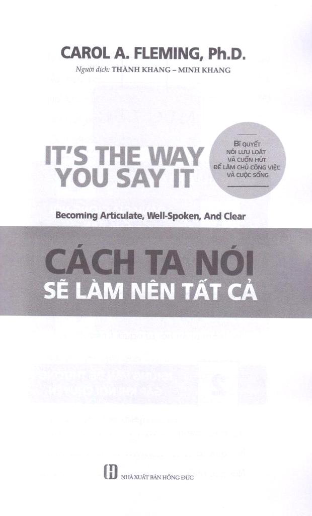 It's The Way You Say It - Cách Ta Nói Sẽ Làm Nên Tất Cả Cách tốt nhất, trực tiếp nhất để truyền đạt sự hiểu biết, trình độ chuyên môn, tính chuyên nghiệp và cá tính của bạn cho người khác là thông qua việc nói chuyện với họ. Thế nhưng, hầu hết mọi người đều không biết giọng nói của m.ình nghe như thế nào. Và ngay cả khi biết được điều đó, nhiều người không nghĩ rằng, họ có thể thay đổi giọng nói của m.ình. Với hơn 30 năm kinh nghiệm, Tiến sĩ Carol A. Fleming sẽ cung cấp cho bạn một hướng dẫn toàn diện, hữu ích để nhận biết và nắm quyền kiểm soát cách bạn giao tiếp với người khác. Cụ thể, sách sẽ đưa ra những lời khuyên và bài tập để bạn: