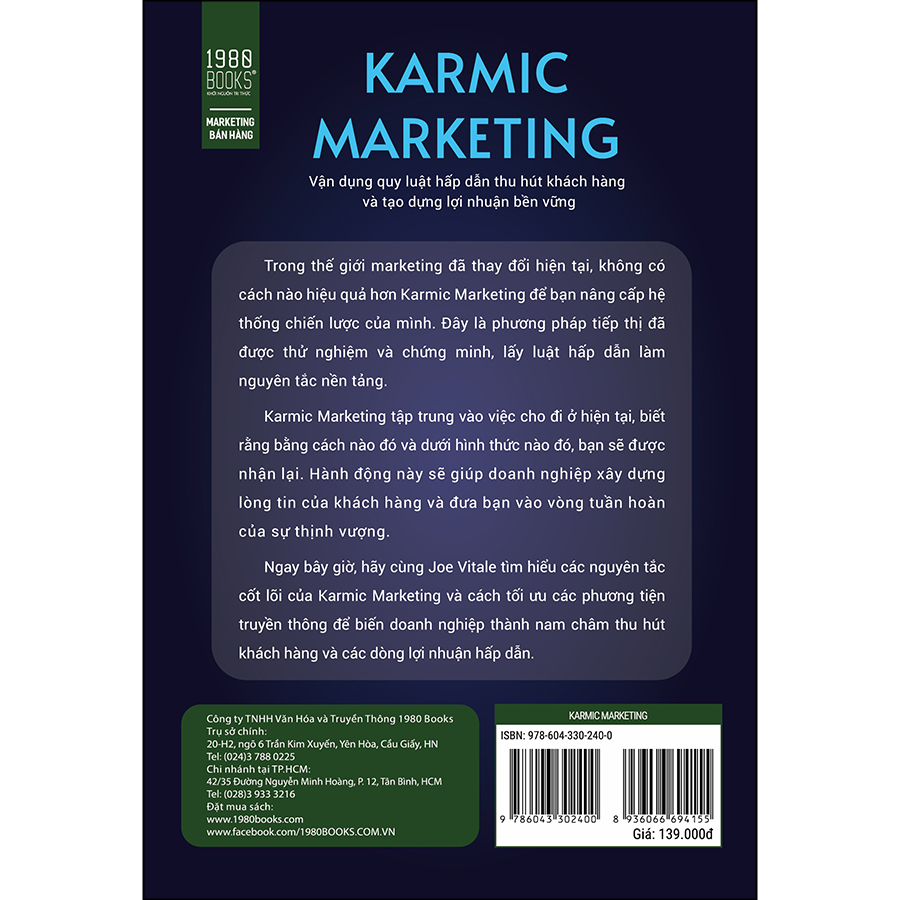 Trong nền kinh tế kỹ thuật số ngày nay, công nghệ thông minh cung cấp thông tin chi tiết về sản phẩm chỉ với một cú nhấp chuột, hoặc thậm chí cung cấp thông tin đó trực tiếp cho người tiêu dùng dưới hình thức được cá nhân hóa tự động. Theo đó, thế giới marketing cũng hoàn toàn thay đổi. Tiếp thị không còn có thể dựa vào các phương hướng không chân thực hoặc thiếu trung thực. Trong thế giới mới này, người tiêu dùng hầu như biết nhiều như bạn về sản phẩm của bạn. Đối thủ có thể dễ dàng cạnh tranh với hoạt động tiếp thị của bạn, nhờ có rào cản gia nhập của Internet. Bạn phải nâng cấp trò chơi của mình. Thế giới không ngừng phát triển, và với tư cách là một nhà tiếp thị hoạt động trong thế giới mới này, bạn phải phát triển cùng với nó. Chúng ta đã bước vào kỷ nguyên mà niềm tin quyết định liệu các nỗ lực marketing của bạn có thành công hay không. Theo Joe Vitale, không có cách nào hiệu quả hơn Karmic Marketing, phương pháp tiếp thị đã được thử nghiệm và chứng minh, lấy luật hấp dẫn làm nguyên tắc nền tảng. Cuốn sách “Karmic Marketing” tập trung vào việc cho đi ở hiện tại, biết rằng bằng một cách nào đó và dưới hình thức nào đó, bạn sẽ được nhận lại. Và đây là cách nó hoạt động: Phần thưởng tức thì của bạn khi cho đi là những cảm giác tốt đẹp mà bạn có. Những cảm xúc này giống như những thanh nam châm sẽ thu hút nhiều những cảm xúc tốt đẹp hơn. Và điều bạn nhận được sau đó là kết quả của quy luật vô hình, rằng bạn sẽ nhận được nhiều hơn từ việc cho đi. Hành động xuất phát từ tình yêu này sẽ giúp doanh nghiệp phát triển bền vững dựa trên lòng tin của khách hàng và đưa bạn vào vòng tuần hoàn của thịnh vượng vĩnh cửu. Trong cuốn sách này, Joe sẽ mô tả phương thức marketing này và chỉ ra cách thức hoạt động của nó khác với các phương thức truyền thống khác. Ông sẽ thảo luận về các nguyên tắc cốt lõi của phương thức marketing mới này cũng như bí mật của các bậc thầy marketing. Bạn sẽ học được những bí quyết về quan hệ công chúng, cách sử dụng các phương tiện truyền thông để tối đa tác dụng của luật hấp dẫn, biến doanh nghiệp thành nam châm thu hút khách hàng và các dòng lợi nhuận hấp dẫn. Giới thiệu về tác giả: Joe Vitale là tác giả của nhiều cuốn sách, đáng chú ý là The Attractor Factor: Five Easy Steps for Creating Wealth or Anything Else from the Inside Out (Tác nhân thu hút: Năm bước dễ dàng để tạo nên sự giàu có và thành công bằng luật hấp dẫn) với hai lần trở thành cuốn sách bán chạy số một, và Zero Limits: The Secret Hawaiian System for Health, Wealth, and Peace (tạm dịch: Không giới hạn: Hệ thống bí mật của Hawaiian cho sức khỏe, sự giàu có và yên bình). Ông là một trong những ngôi sao của bộ phim ăn khách The Secret (Bí mật) đồng thời tham gia các chương trình truyền hình bao gồm Larry King Live và Extra. Ông là tác giả của cuốn sách duy nhất về bí mật kinh doanh của thiên tài marketing thế kỷ 19, P. T. Barnum. Cuốn sách có tên là There’s a Customer Born Every Minute (tạm dịch: Mỗi phút lại có một khách hàng sinh ra). Nổi tiếng với những mánh lới quảng cáo, Joe nhận được sự chú ý của truyền thông địa phương và cả nước. Hai cuốn sách nổi tiếng khác của ông ấy là Hypnotic Writing (Thôi miên bằng ngôn từ) và Buying Trances: A New Psychology of Sales and Marketing (tạm dịch: Trạng thái mua hàng: Tâm lý học mới về Bán hàng và Marketing). Joe được gọi là “Đức Phật” của thế giới Internet.