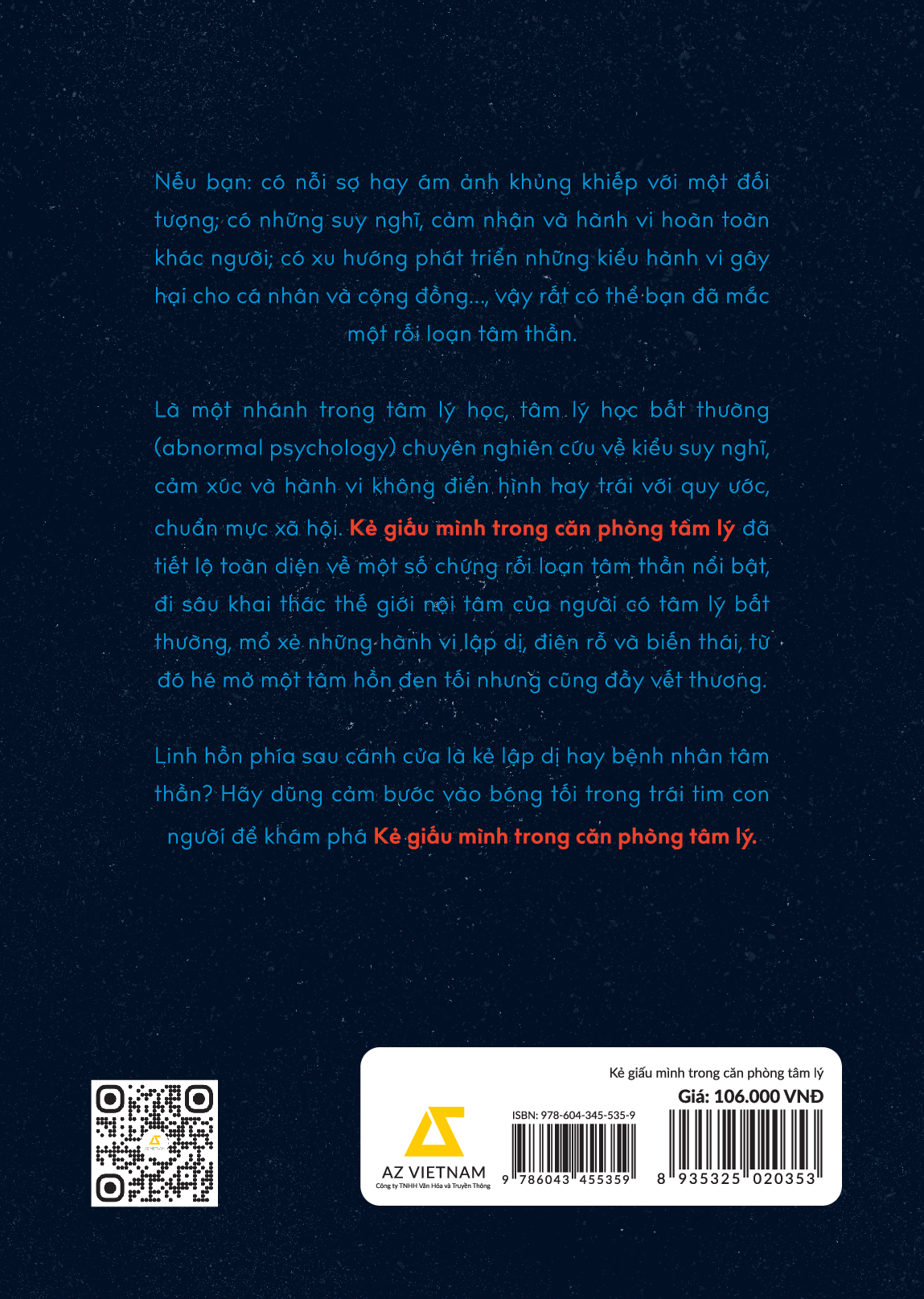 “Kẻ giấu m.ình trong căn phòng tâm lý” chính là cuốn sách về những mặt tối của con người. Dựa trên nhánh tâm lý bất thường (abnormal psychology) trong tâm lý học, cuốn sách giới thiệu với độc giả những chứng bệnh tâm lý, tâm thần ít được biết đến.