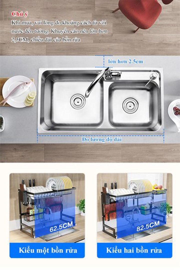 Kệ gác bồn rửa chán có thiết kế đặc biệt, thông minh và tiện dụng, có thể thay đổi kích thước chiều dài nên phù hợp với hầu hết các loại bồn rửa: Kích thước