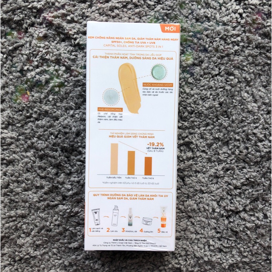 Thành phần: Màng lọc Mexoryl độc quyền: bảo vệ da trước tác hại của tia UVB (gây bỏng rát) và tia UVA (gây kích ứng, lão hóa sớm dẫn đến ung thư da) Phersocinol và vitamin E: giúp giảm thâm nám hiệu quả & làm đều màu da Alkyl Benzoate: giúp da khô thoáng, không gây nhờn rít, không để lại vệt trắng trên da Aluminium Starch Octenylsuccinate: giảm bóng dầu, không gây khô da, cho d cảm giác như được dưỡng ẩm Nước khoáng Vichy: Tái tạo & nuôi dưỡng hàng rào bảo vệ da, cho da căng khỏe Hiệu quả :