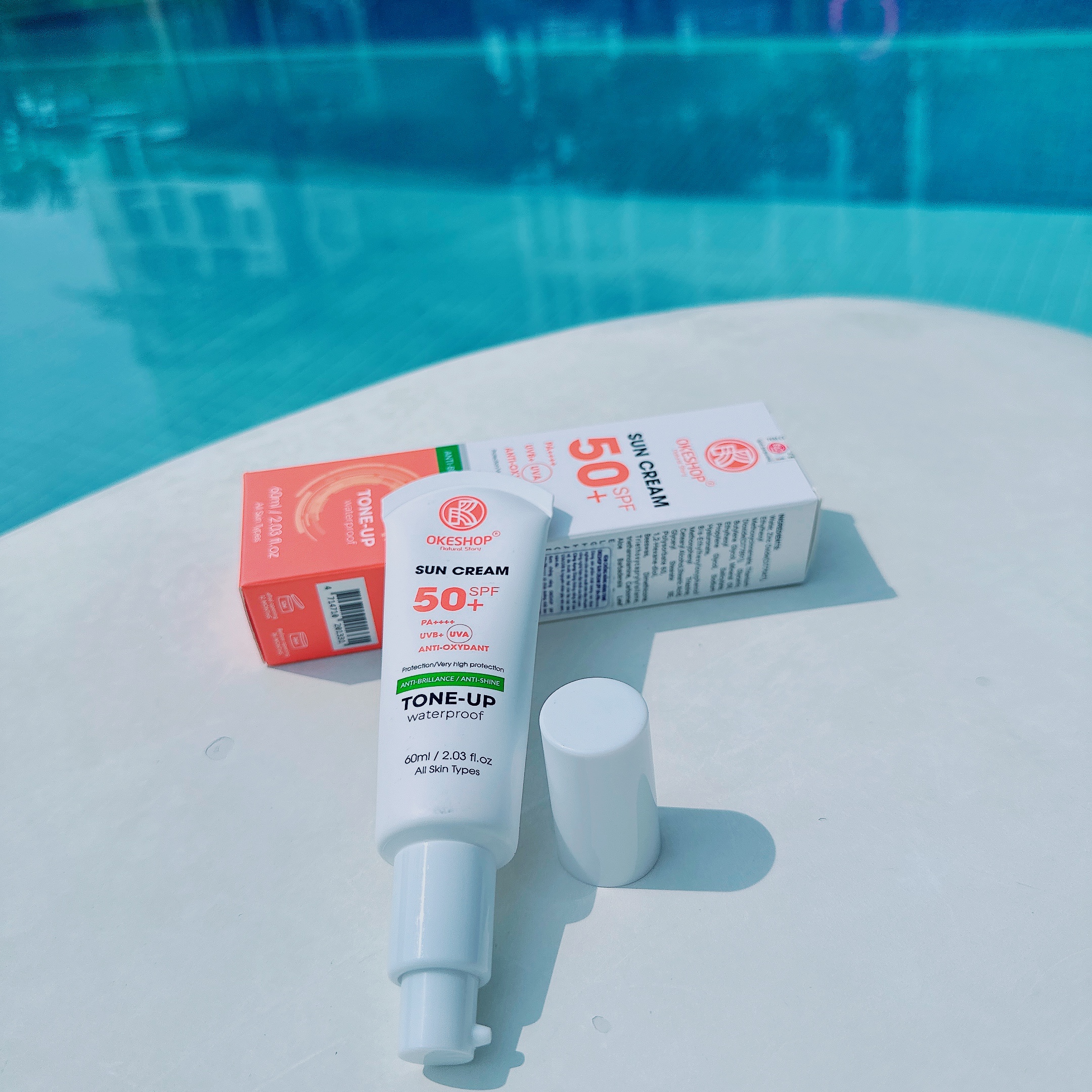 Thoải mái tận hưởng những chuyến du lịch ngoài trời mà không phải lo làn da bị đen sạm nữa, là sản phẩm chống nắng cho mọi loại da OKESHOP SPF 50+ PA++++ Anti-oxydant sẽ là lựa chọn tối ưa cho ngày hè sắp tới Chống nắng TONE-UP OKESHOP SPF 50+ PA++++ Anti-oxydant 60ml Ngày nay trên thị trường mỹ phẩm có vô vàn các sản phẩm kem chống nắng nếu vẫn chưa biết lựa chọn sản phẩm nào để sử dụng thì hãy thử dòng sản phẩm kem chống nắng nâng tông của OKESHOP chắc chắn đây sẽ là sản phẩm khiến bạn cảm thấy hài lòng. CÔNG DỤNG TONE-UP OKESHOP SPF 50+ PA++++ Anti-oxydant 60ml SUN CREAM OKESHOP SPF 50+ PA++++ Anti-oxydant 60ml giúp ngăn chặn 99% tia UV với chỉ số chống nắng cao SPF50+ PA++++ chống được tối đa tia UVA/UVB ngay cả khi bạn không trang bị cho mình đầy đủ áo, khẩu trang khi ra ngoài. OKESHOP SPF 50+ PA++++ Anti-oxydant 60ml giúp bảo vệ làn da của bạn an toàn dưới ánh nắng mặt trời mà vẫn dịu nhẹ, không gây hại cho da. Chỉ số SPF 50+ cho khả năng chống tia UVB trong thời gian dài bảo vệ làn da không bị cháy nắng, sạm đen. Chỉ số PA++++ ngăn chặn triệt để tia UVA - là tác nhân gây nên hiện tượng lão hóa da sớm như hình thành nếp nhăn, đốm nâu. SUN CREAM OKESHOP sẽ giúp nuôi dưỡng cho làn da bạn luôn ẩm mượt, gia tăng độ đàn hồi, chống oxi hóa, tăng cường sức khỏe cho da khỏe mạnh, bảo vệ da khỏi những tác động tiêu cực từ môi trường. Đồng thời, kem chống nắng còn bổ sung lượng nước, cấp ẩm dồi dào giúp làn da mềm mại, mượt mà hơn với chiết xuất dưỡng da từ thiên nhiên của hoa trà xanh, nha đam, hắc mai biển mang lại cho các nàng một cảm giác thoải mái dịu nhẹ thanh mát trong cả ngày dài Một điểm cộng của TONE-UP OKESHOP SPF 50+ PA++++ Anti-oxydant 60ml nữa đó chính là khả năng chống thấm nước, mồ hôi và kể cả lượng dầu nhờn tiết ra trên da nên chúng ta không phải lo lắng lớp kem chống nắng sẽ bị trôi mất. Cũng chính vì tính năng thẩm thấu sâu vào bên trong bề mặt da nhanh chóng nên đây sẽ là sản phẩm lý tưởng để sử dụng mỗi khi đi tắm biển, bơi lội hay tiếp xúc môi trường nước. HƯỚNG DẪN SỬ DỤNG: