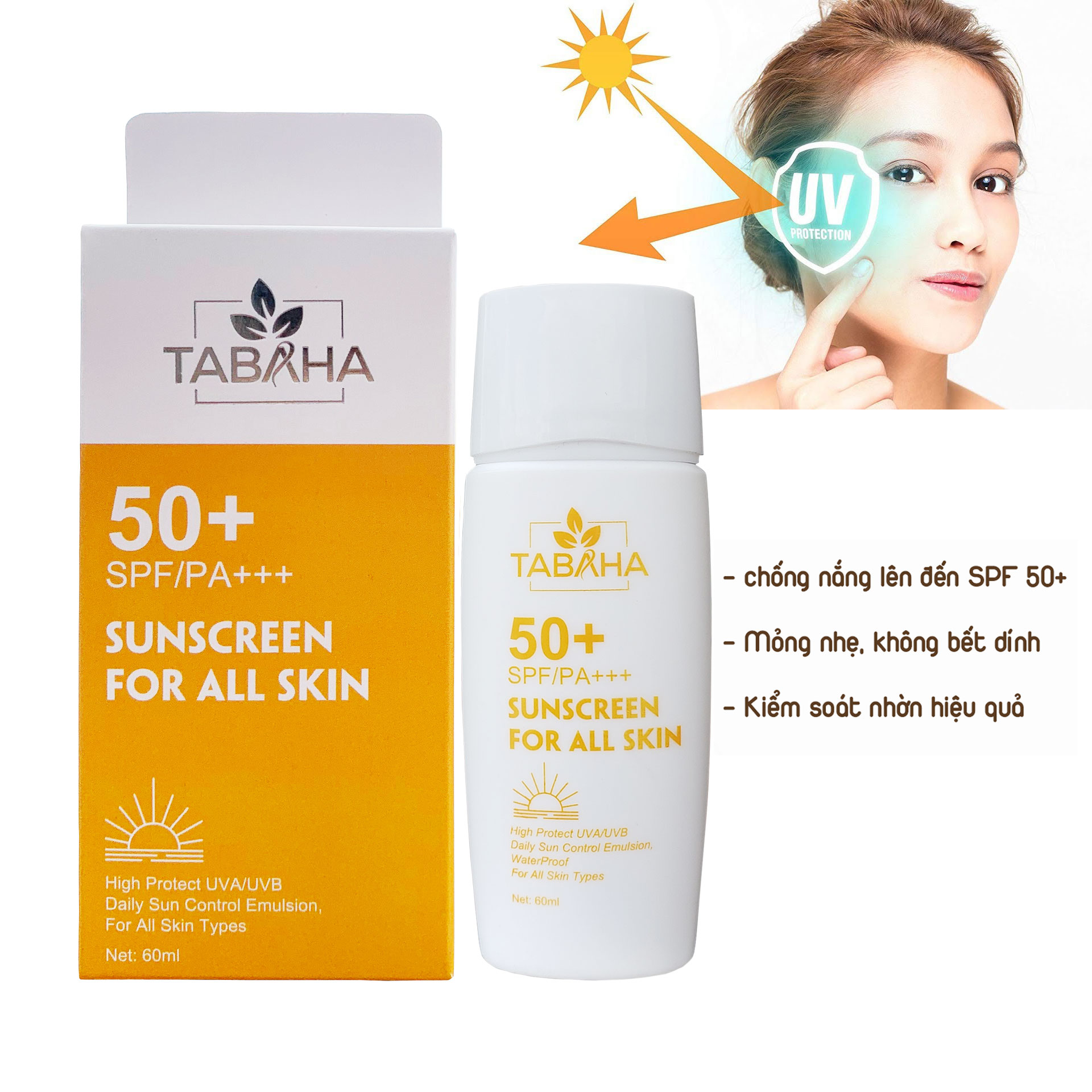 Kem chống nắng nâng tông da TABAHA Sunscreen For All Skin 60ml Chống mọi tia UV- Che phủ tự nhiên - Nâng tông da sáng tựa cánh hồng tinh khôi CHÔNG NẮNG HIỆU QUẢ VỚI: