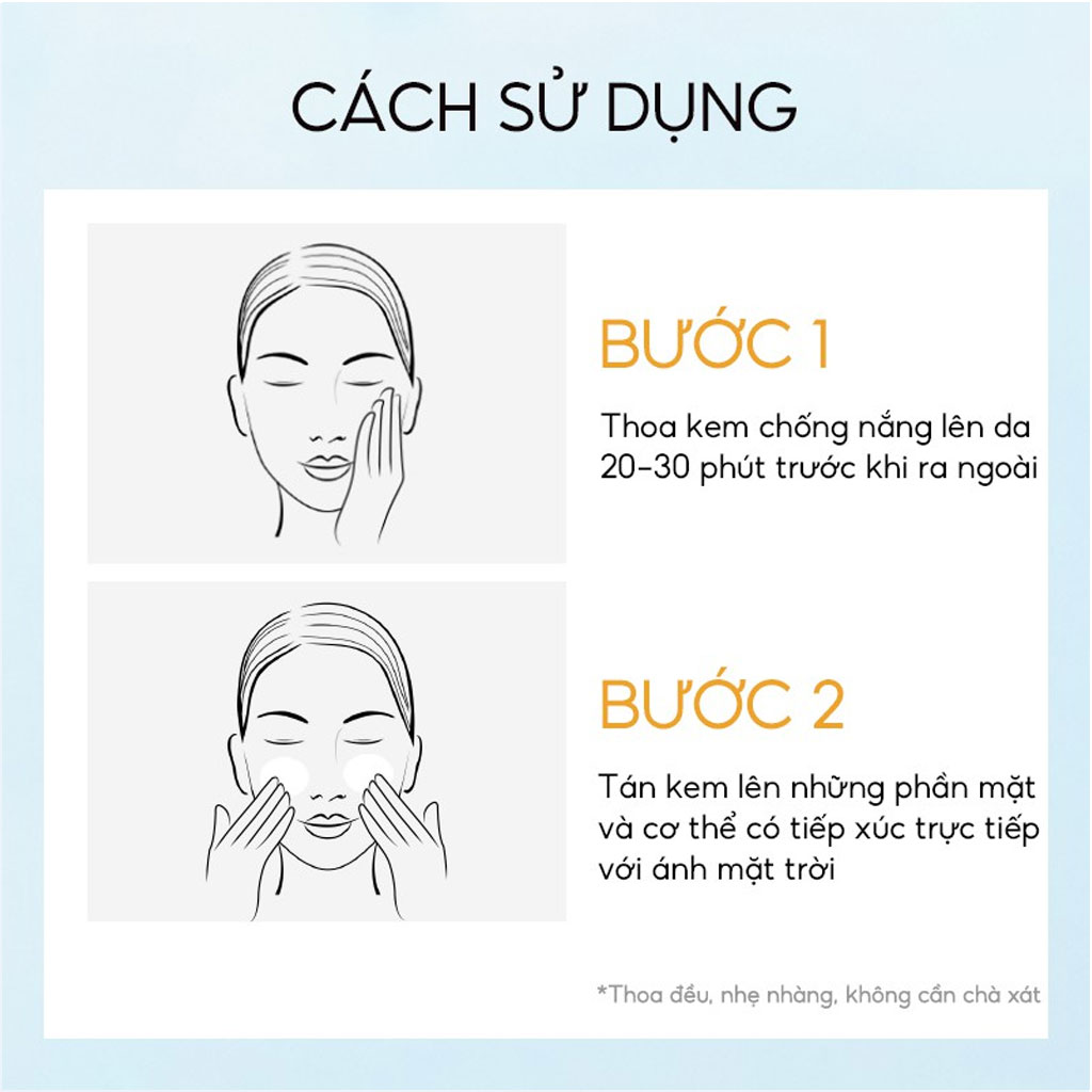- Thoa đều sản phẩm trước khi ra nắng 10 đến 20 phút.