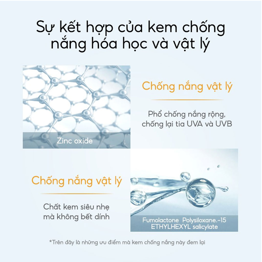 - Đồng thời SPF50+ chống tia UVB cực mạnh, bảo vệ da không bị bỏng rát, cháy nắng trong nhiều giờ liền.