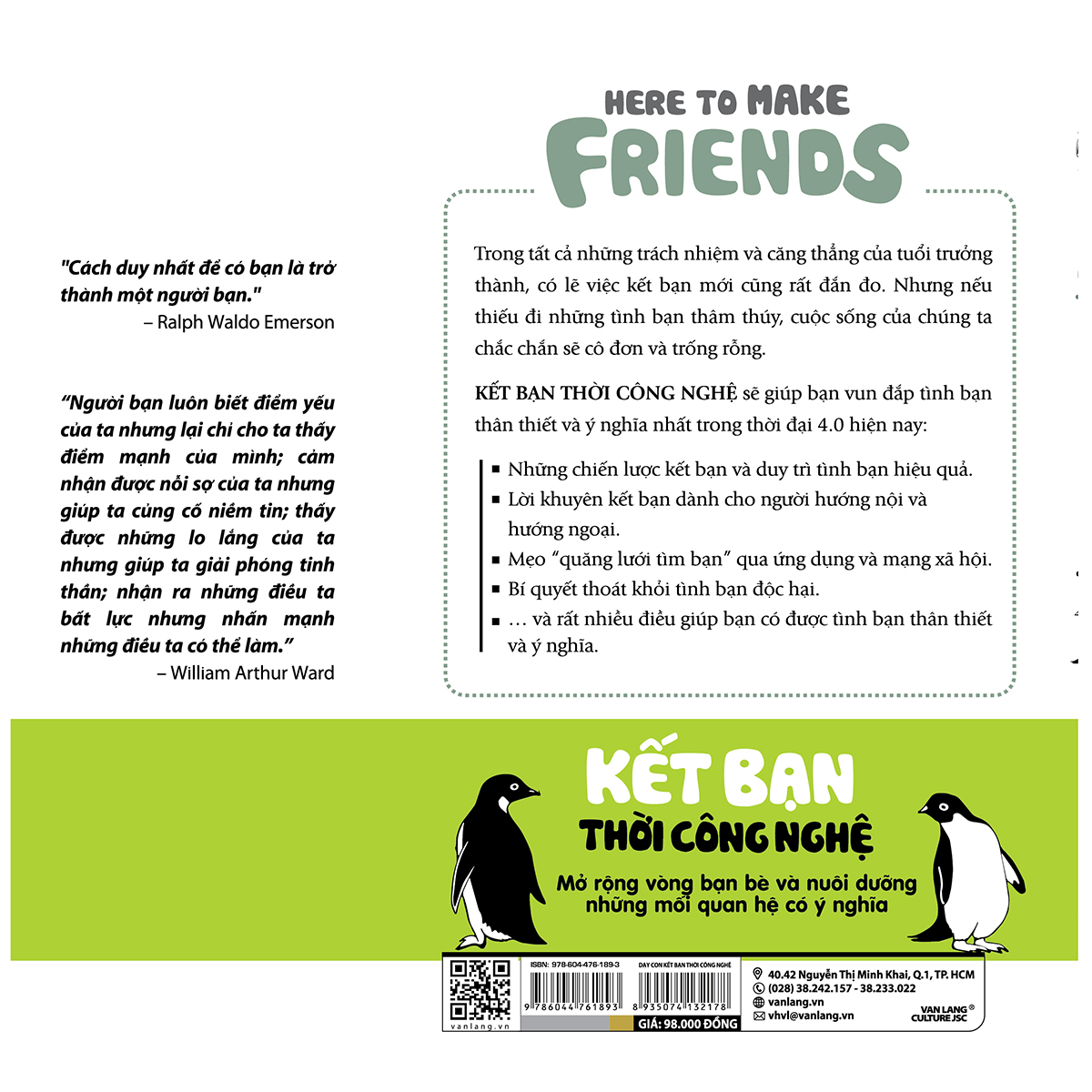 Trong tất cả những trách nhiệm và căng thẳng của tuổi trưởng thành, có lẽ việc kết bạn mới cũng rất đắn đo. Nhưng nếu thiếu đi những tình bạn thâm thúy, cuộc sống của chúng ta chắc chắn sẽ cô đơn và trống rỗng. KẾT BẠN THỜI CÔNG NGHỆ sẽ giúp bạn vun đắp tình bạn thân thiết và ý nghĩa nhất trong thời đại 4.0 hiện nay: Những chiến lược kết bạn và duy trì tình bạn hiệu quả. Lời khuyên kết bạn dành cho người hướng nội và hướng ngoại. Mẹo “quăng lưới tìm bạn” qua ứng dụng và mạng xã hội. Bí quyết thoát khỏi tình bạn độc hại. … và rất nhiều điều giúp bạn có được tình bạn thân thiết và ý nghĩa.