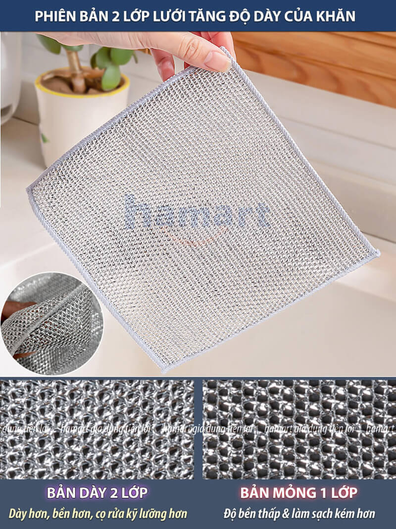 Khăn có 2 lớp lưới kim loại, giúp việc cọ rửa kỹ lưỡng, sử dụng lâu dài mà không lo rỉ sét