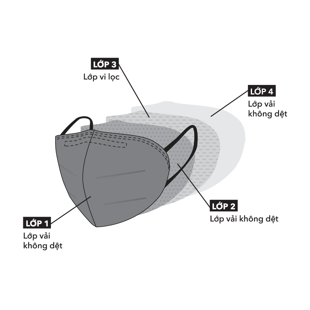 Thành phần - Các lớp vải gồm: 1 lớp ngoài cùng và 3 lớp trong cùng là các lớp vải không dệt, lớp thứ 2 là màng lọc Meltblown Microfilter. - Dây thun đeo tai.