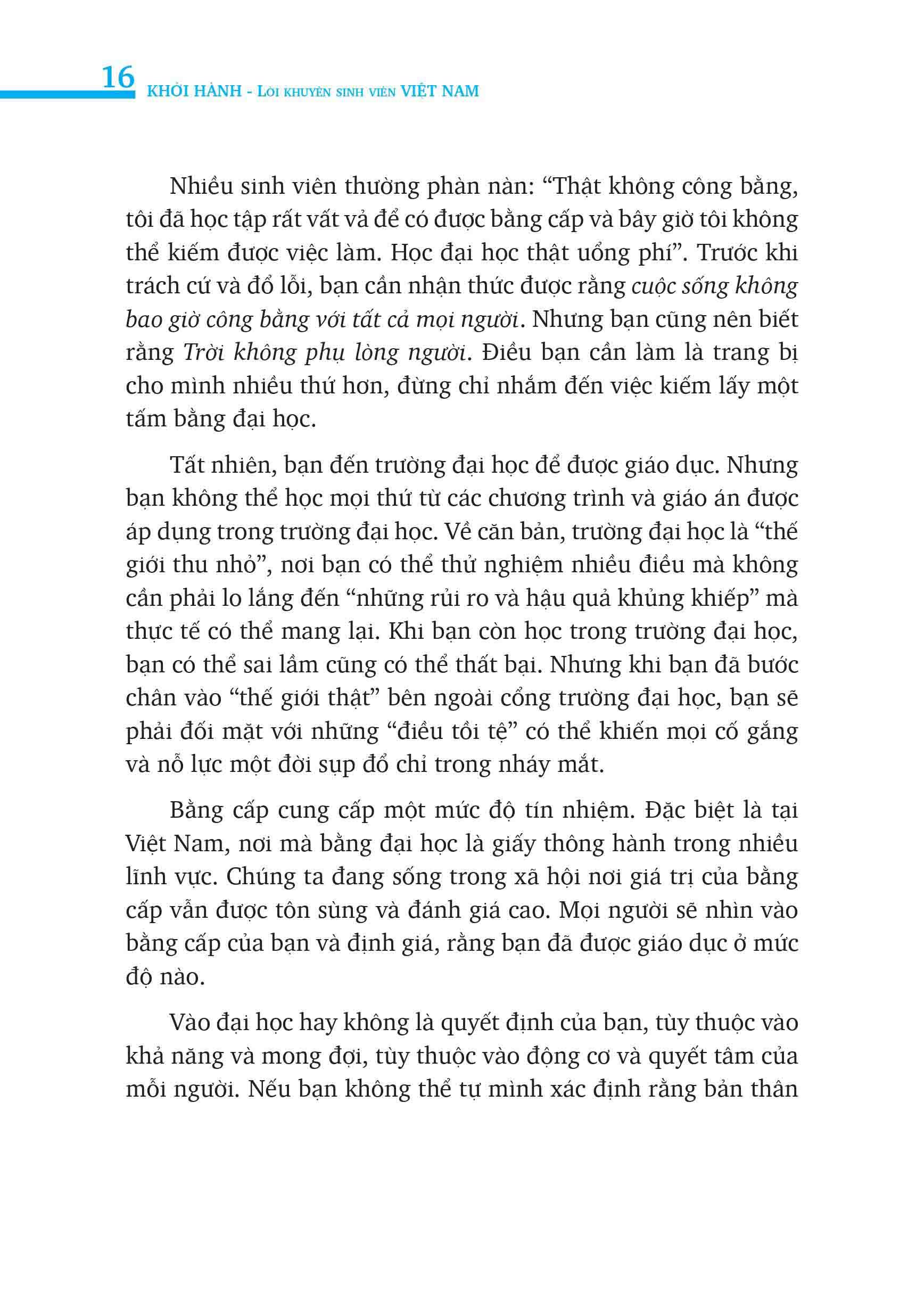 Học sinh cấp 3, học sinh cuối cấp chuẩn bị tốt nghiệp trung học phổ thông và sinh viên đại học có thể sử dụng cuốn sách này như một cẩm nang để tự mình định hướng, lên kế hoạch và quyết định tương lai của chính bản thân mình./p pKhởi hành được bố cục theo từng chủ đề, học sinh và sinh viên có thể đọc theo từng phần với tư cách là một tập hợp những bài viết chia sẻ kinh nghiệm; hoặc có thể đọc một mạch theo hệ thống để có cái nhìn rõ ràng hơn về thị trường lao động, về việc giáo dục trong hiện tại và tự giáo dục trong tương lai, thông qua đó chủ động nắm bắt cách học sao cho đạt hiệu quả cao nhất về kiến thức và biết ứng dụng vào thực hành.Từng đề mục của cuốn sách được sắp xếp như một kiểu đối thoại với sinh viên, học sinh, giúp các bạn dễ dàng tiếp nhận, nắm bắt những thông tin quan trọng.