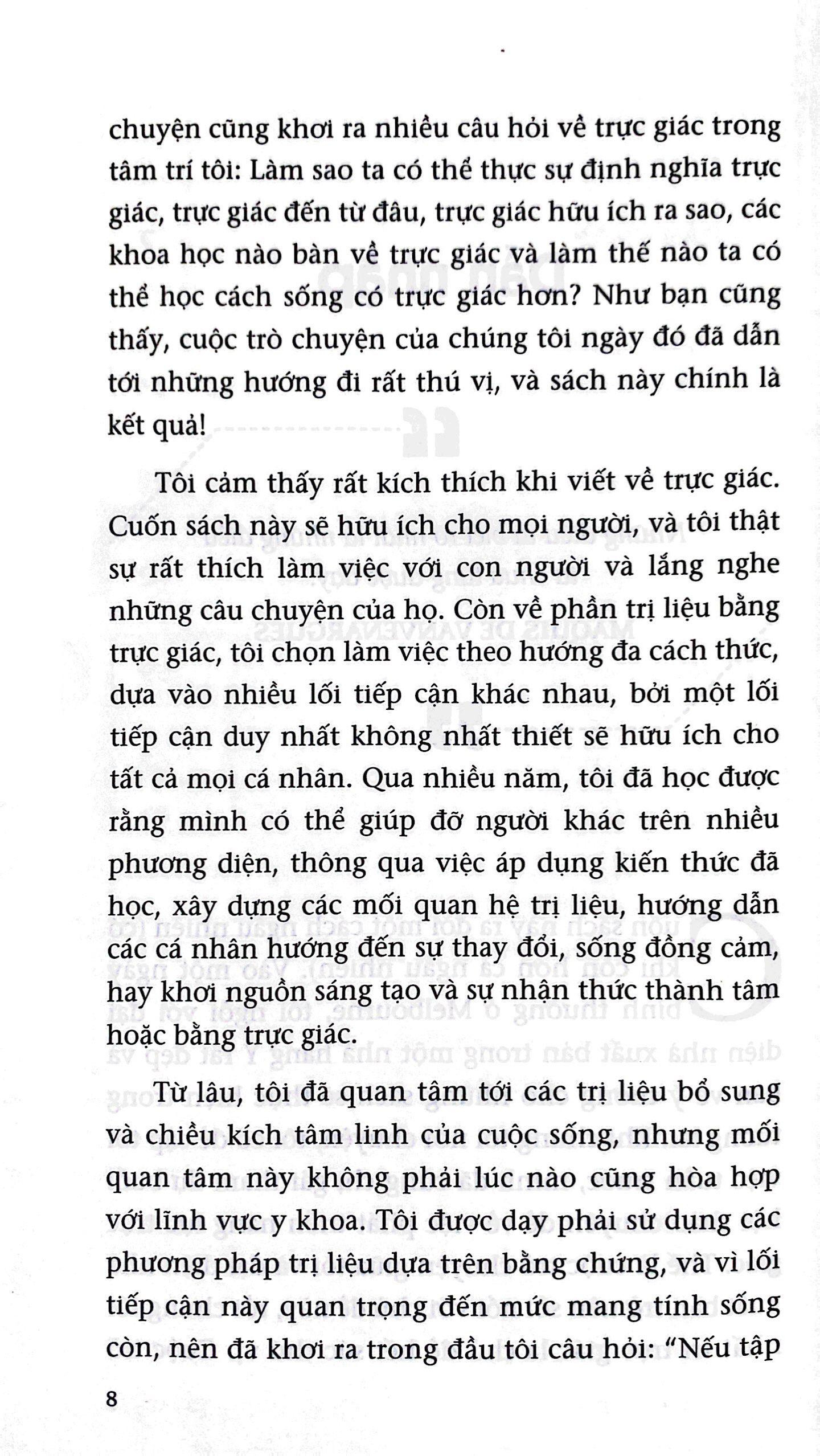 - Bác sĩ Cate Howell, Khơi Nguồn Năng Lực Trực Giác Trực giác là điều hầu hết mọi người sẽ trải nghiệm trong đời, vào lúc này hoặc lúc khác. Đó là linh cảm, là tiếng nói nội tâm hay “giác quan thứ sáu”. Nhưng liệu ta có thể chủ động phát triển trực giác và học cách ứng dụng nó tốt hơn cho cuộc sống? Bác sĩ Cate Howell tin là ai cũng có thể! Trong cuốn sách lý thú này, bác sĩ Howell khám phá trực giác là một phần của triết học, tâm lý học, tôn giáo và tâm linh từ cổ xưa cho đến hiện đại như thế nào. Bà cũng tìm hiểu về khoa học đằng sau trực giác, và cách mô tả kinh nghiệm trực giác theo chức năng não bộ. Cuối cùng, bà vạch ra chương trình bảy bước nhằm phát triển và sử dụng trực giác giúp cải thiện cuộc sống hàng ngày, để mỗi người cảm nhận được sự bình yên, niềm hạnh phúc và mục đích đời m.ình."