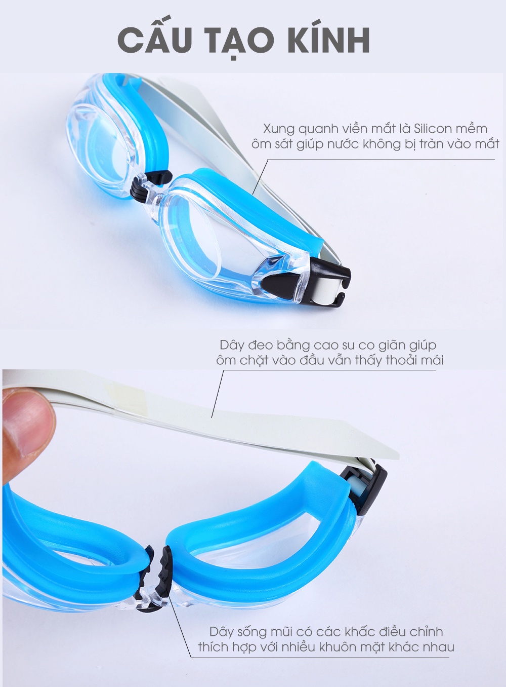 - Tròng kính được thiết kế góc nhìn rộng, độ bền cao, không để nước lọt vào mắt của bé, không ảnh hưởng đến thị lực.